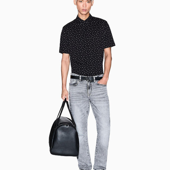 Jeans cinque tasche realizzati in denim stretch di alta qualità, progettati per offrire comfort e stile in ogni occasione. Il fit slim valorizza la silhouette mantenendo una vestibilità confortevole grazie alla naturale elasticità del tessuto. I dettagli lievemente délavé donano un carattere vissuto ma sofisticato, perfetto per look casual ricercati. Un modello essenziale nel guardaroba maschile contemporaneo. Tessuto: 99% cotone, 1% elastan. Etichetta in pelle: 100% pelle di vitello. Denim stretch comfort. Chiusura con zip e bottone logato. Modello cinque tasche. Fit slim. Impunture tono su tono. Logo A|X ricamato sulla tasca frontale. Effetto leggermente délavé. Passanti per cintura. Il capo non è resistente ai lavaggi a secco. Non usare lasciugatrice. Non asciugare in tamburo rotativo. Non usare candeggina. Il candeggio non è consentito; si consiglia di utilizzare detersivi per colori senza agenti sbiancanti per evitare di sbiadire i tessuti. Stirare con temperatura massima di 110°C. La stiratura a vapore può causare danni irreversibili.