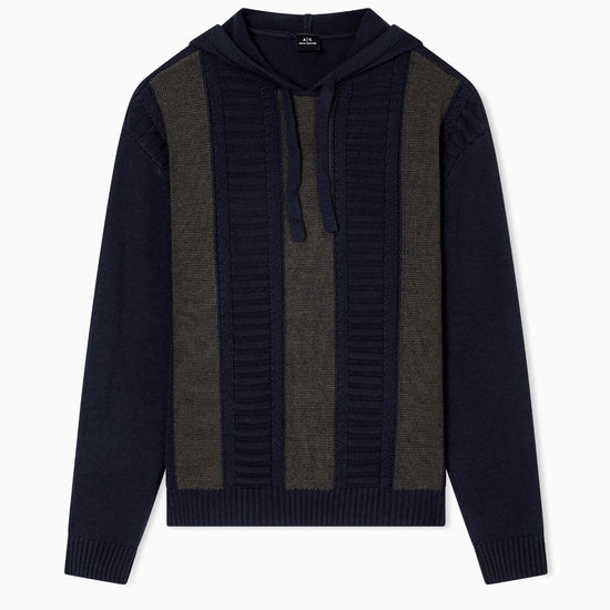 Maglione con cappuccio in maglia pesante dal design a blocchi di colore blu navy e marrone, realizzato in tessuto 50% acrilica e 50% lana vergine con dettagli in maglia principale 49% acrilica, 47% lana vergine, 3% poliammide e 1% elastan, e dettagli secondari 50% acrilica e 50% lana vergine; caratterizzato da texture a coste e vestibilità comoda per un look casual e ricercato dallo stile street contemporaneo