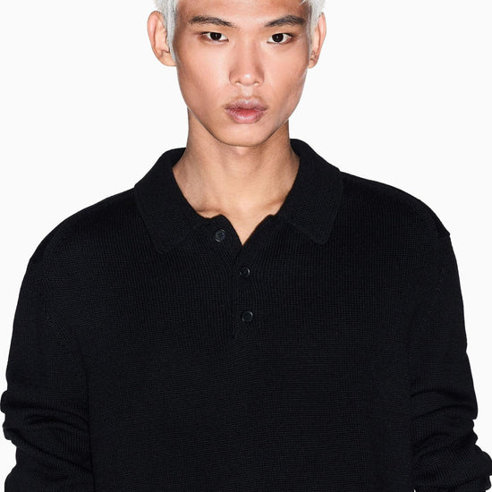 Long-sleeved polo shirt in a wool and cotton knit, perfect for comfort and style on any occasion. The soft, natural texture feels pleasant on the skin and is ideal for transitional wear. The classic design with a polo collar and button placket lends timeless elegance, while ribbed cuffs complete the refined and versatile look. Main fabric: 34% cotton, 33% acrylic, 33% virgin wool. Knit details: 33% cotton, 31% acrylic, 31% virgin wool, 4% polyamide, 1% elastane.