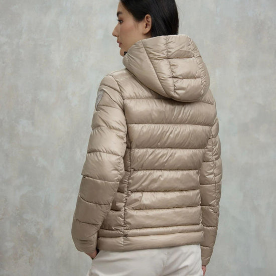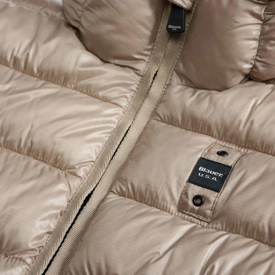 This women's Blauer jacket in water-repellent micro-rip nylon with a slim fit is perfect for the winter season thanks to its combination of elegance and functionality. Crafted with a light check pattern and trendy colors, it offers a feminine and flattering fit. The sustainable Sorona® Aura padding ensures warmth, softness, and lightness, while maintaining an environmentally friendly approach. Lined in contrasting nylon for a refined and contemporary look, it features a fixed hood with drawstring, a hidden zip closure with a slider cover at the collar, front zip pockets, and an adjustable drawstring hem. The internal pockets, one zipped and one with Velcro, ensure everyday practicality. Distinctive Blauer details, such as a logo patch and loop, symbolize authenticity and quality, complete the design.