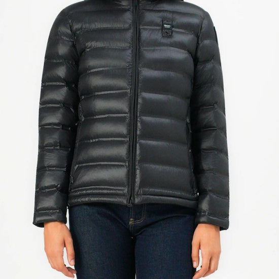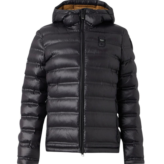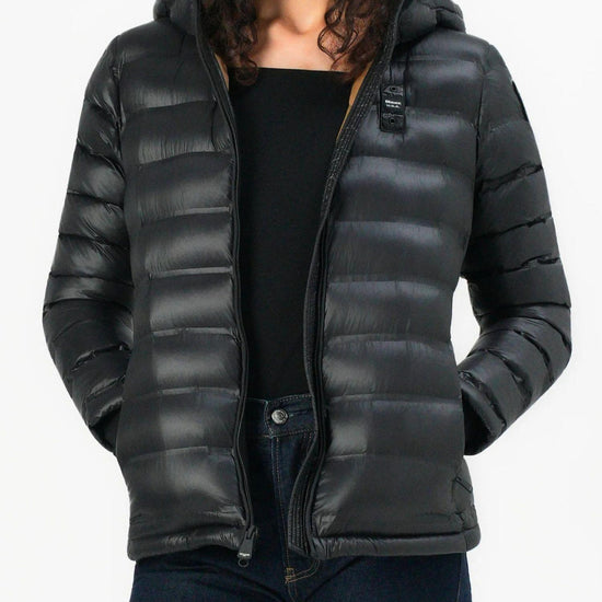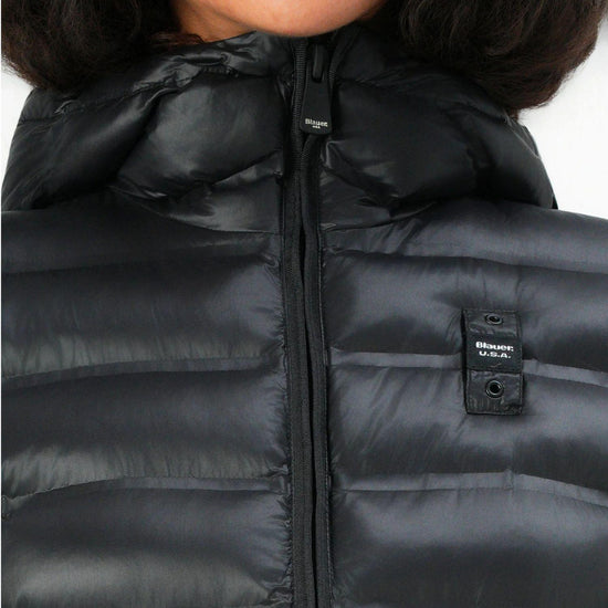 Giacca invernale in nylon con cuciture nastrate a righe orizzontali e due cuciture laterali per un effetto sfiancato, cappuccio fisso con coulisse, imbottitura leggera ed ecologica in ovatta Repreve, fodera in nylon a contrasto, chiusura con zip nascosta, tasche con zip e copri cursore, coulisse regolabile sul fondo, tasche interne aperte e con velcro, patch e passante con logo per uno stile moderno e funzionale.
