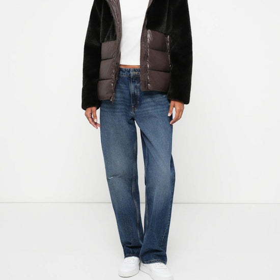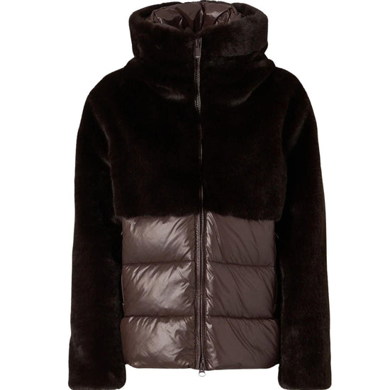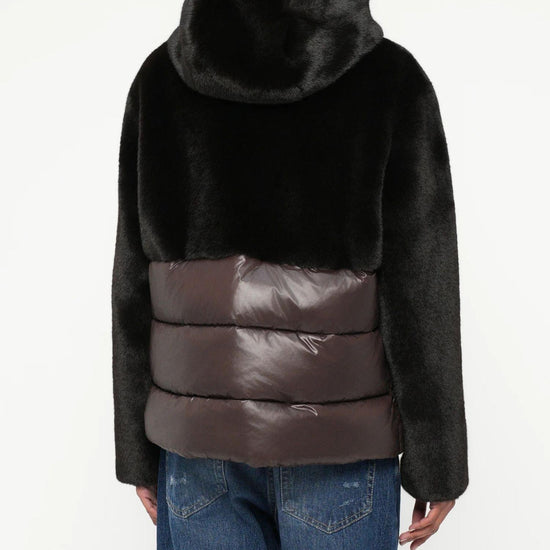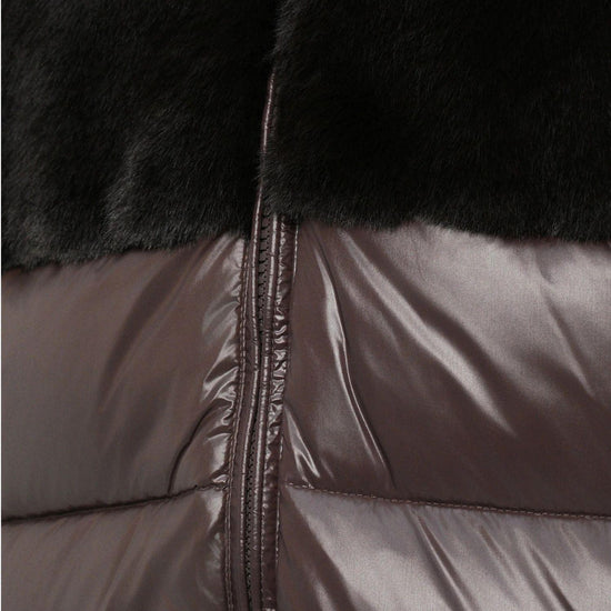 Giacca invernale in ecopelliccia nella parte superiore e nylon lucido nella parte inferiore con cappuccio fisso in pelliccia ecologica e coulisse, imbottita con ovatta Sorona Aura per un calore ottimale, foderata in nylon lucido tono su tono, chiusura con zip, tasche con zip e copri cursore, fondo manica doppio con elastico interno e coulisse sul fondo, tasche interne con velcro, ideale per affrontare gli inverni più rigidi con stile e comfort.