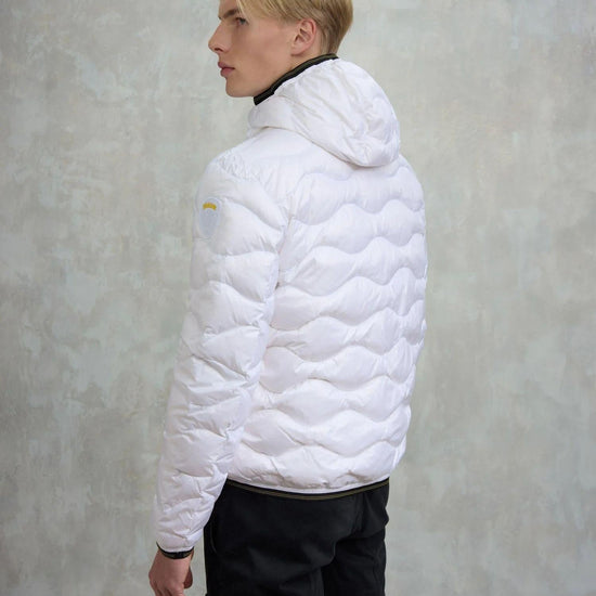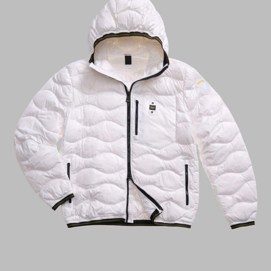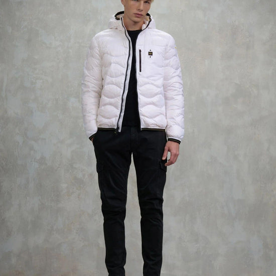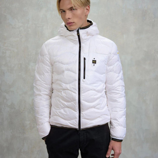 Blauer men's quilted down jacket with a horizontal wave design, a fixed hood, and a chest pocket that adds a functional detail to the brand's classic design. Featuring a matching lining and padded with 90/10 down (165g), it provides lightweight warmth ideal for the cold season. It features a zip closure with a zip cover at the collar, front pockets, a zipped chest pocket, and double interior pockets, both open and with Velcro closures. Finished with a striped elastic on the hood, cuffs, and hem, it is finished with a Blauer logo patch and loop for an authentic and distinctive look.