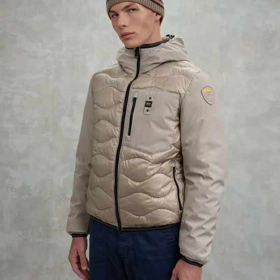 A monochrome down jacket with a modern, sporty style, crafted with lightweight, smooth neoprene sleeves and a body in shiny, wave-quilted nylon. Featuring a fixed hood and a matching lining, it offers warmth and comfort thanks to the 50% polyester/50% down blend, ideal even in adverse weather conditions. It features a zip closure with a zip puller at the collar, front pockets, a zipped chest pocket, and convenient internal pockets with Velcro closures. Distinctive details such as the striped elastic on the hood, cuffs, and hem, and a logo patch, complete the versatile, contemporary design.