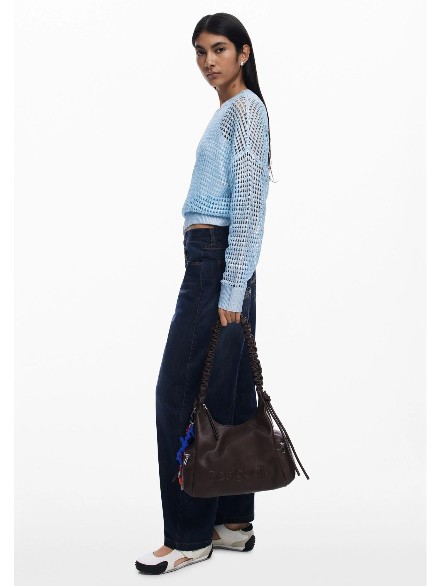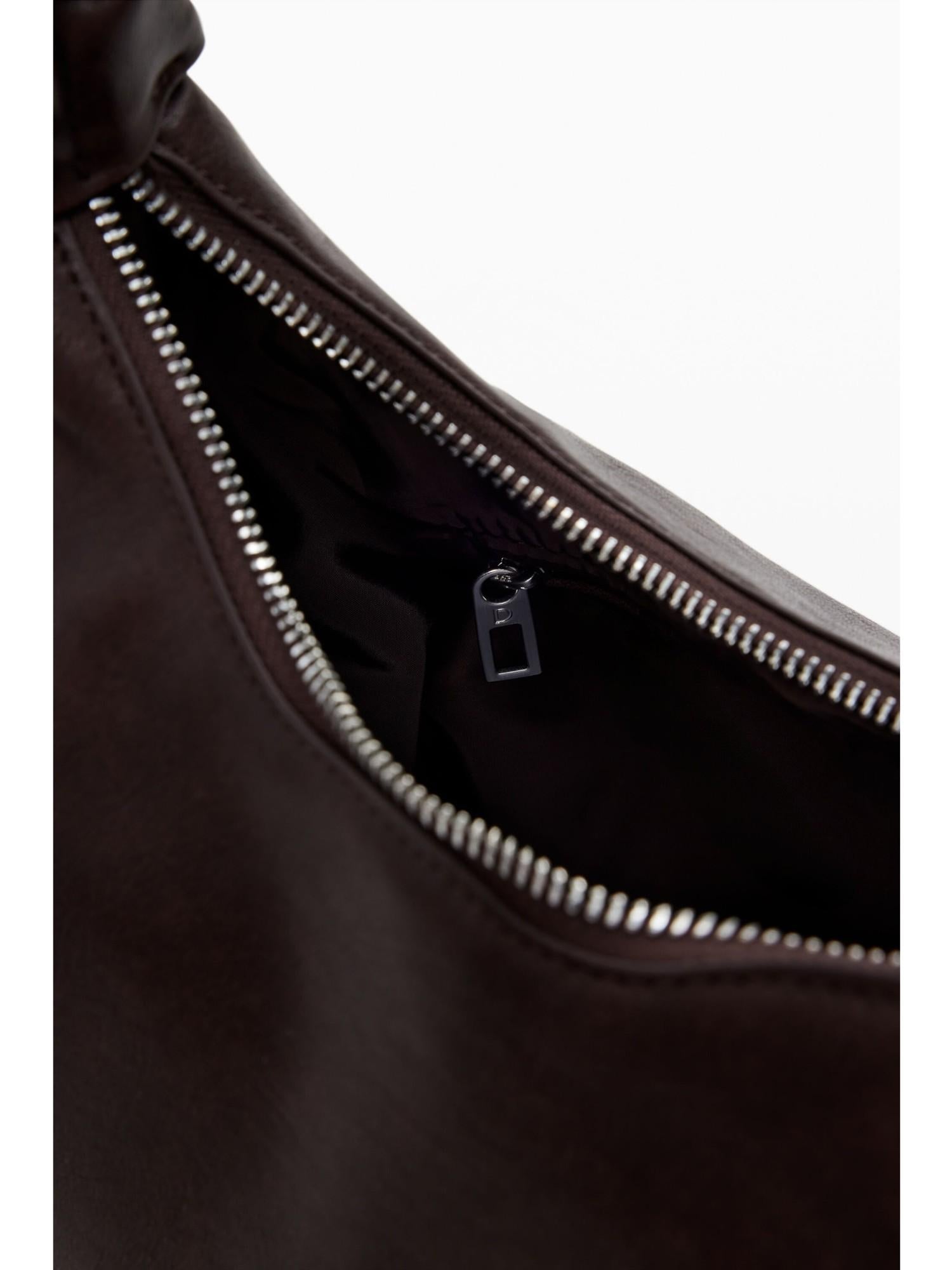 Medium handbag in solid color leather-look fabric with 3D-effect logo, adjustable gathered handle, and removable key ring. Color: solid color. Side pockets. Interior zippered pocket. Zip closure. Adjustable gathered handle. 3D-effect logo. Removable key ring. Leather-look. Designed in Barcelona. Dimensions: 29.5 x 14 x 19 cm. External composition: 100% polyurethane. Internal composition: 100% polyester. Trimming fabric material: 100% polyurethane.