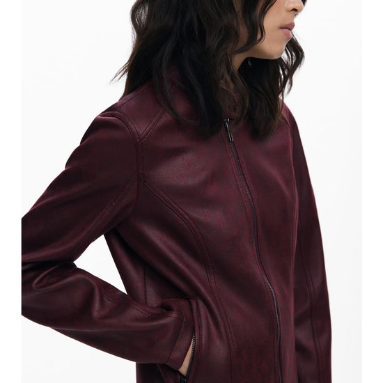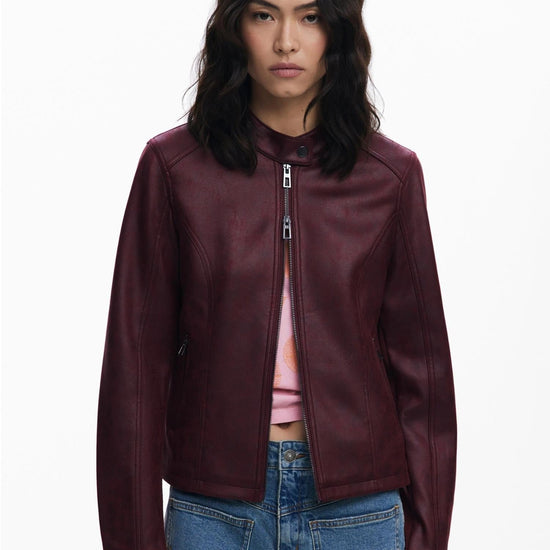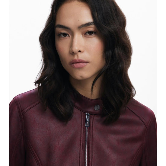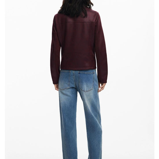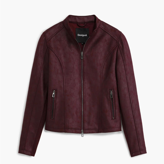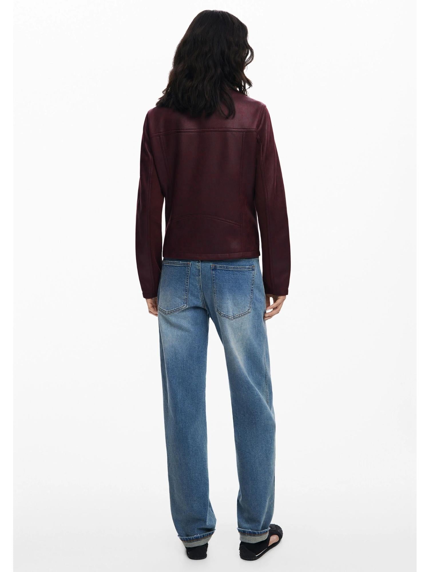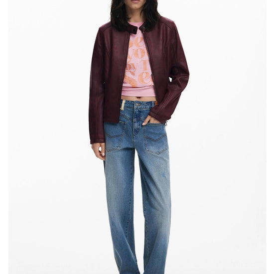 Women's cropped leather-look jacket with a mandarin collar and front zip closure, featuring a modern and versatile design. The knitted sleeves add a refined contrast and ensure comfort and freedom of movement. Front pockets complete the practical and functional look. Crafted from sustainable recycled polyester, this jacket combines style and environmental responsibility. Part of the Fall/Winter 2025 collection, designed in Barcelona, it's perfect for an elegant and contemporary urban look. Outer fabric: 96% polyester, 4% elastane. Lining: 100% recycled polyester.