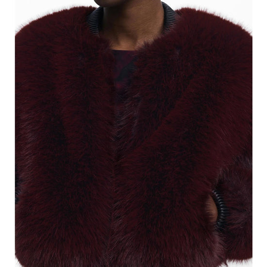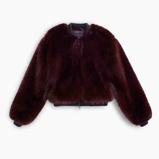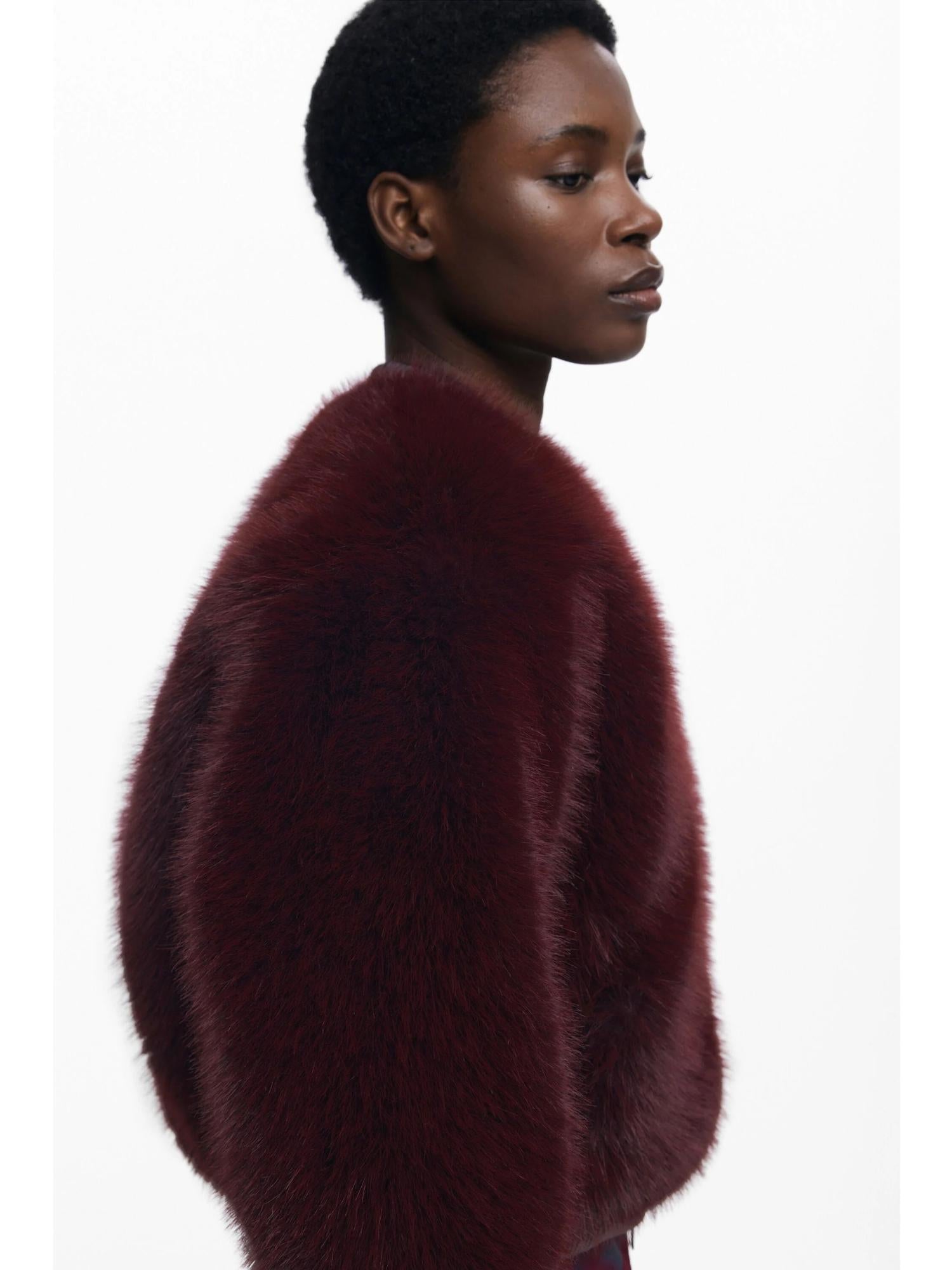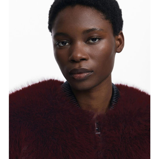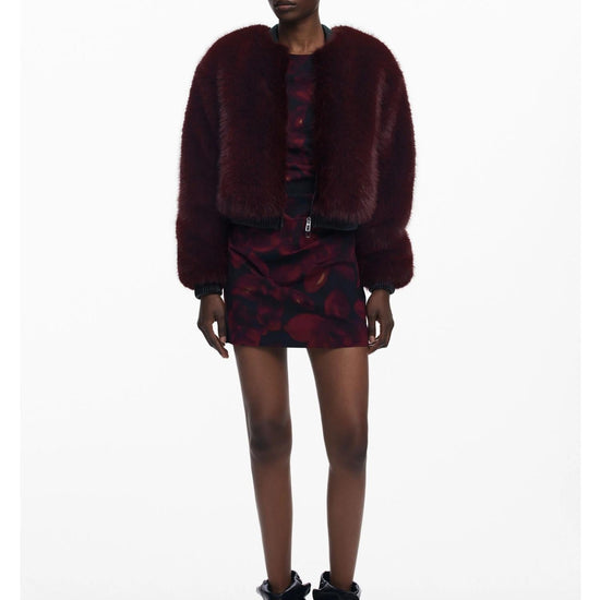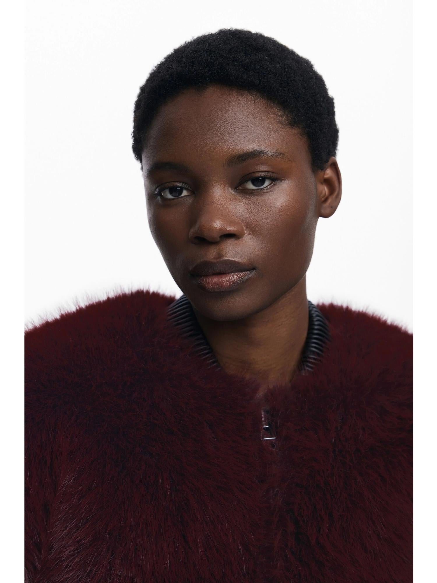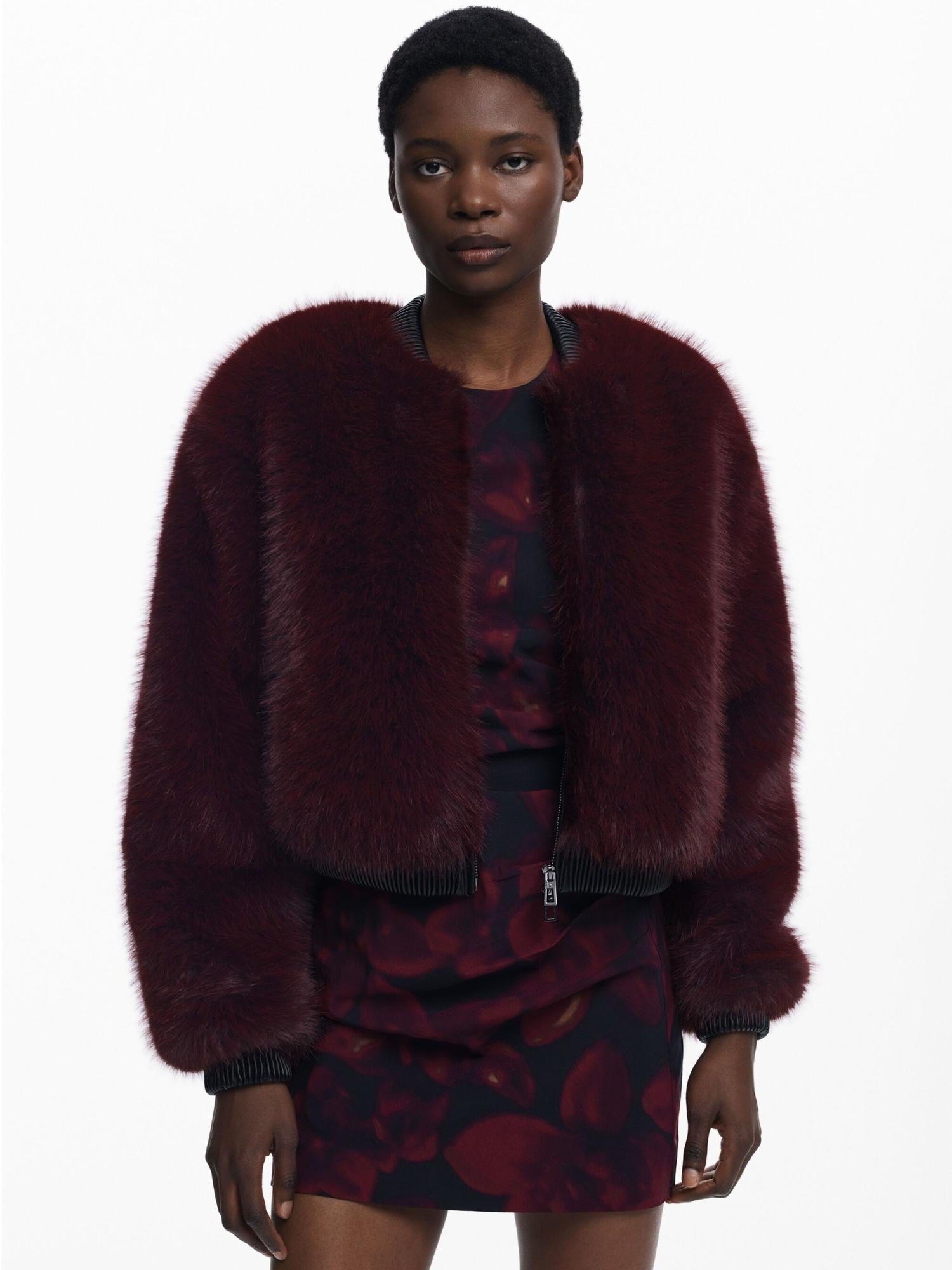 Giacca corta da donna in pelliccia sintetica color lampone, ispirata allo stile bomber per un look contemporaneo e sofisticato. Realizzata in morbido poliestere riciclato, unisce comfort, calore e sostenibilità. Presenta collo rotondo in maglia, maniche lunghe e chiusura frontale con cerniera a contrasto, che aggiunge un tocco moderno al design. Il taglio regular fit valorizza la figura mantenendo una vestibilità comoda. Parte della collezione Autunno/Inverno 2025, progettata a Barcellona, questa giacca è perfetta per completare outfit urbani e casual-chic. Composizione esterna: 100% poliestere riciclato. Fodera interna: 52% poliestere, 48% viscosa.