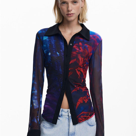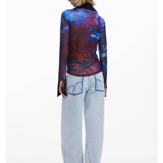 Maglietta in tulle a maniche lunghe con polsini larghi, abbottonatura frontale e colletto a camicia con stampa arty. Fit regular. Colletto a camicia. Manica lunga. Chiusura frontale. Tessuto in tulle. Realizzato con materiali sostenibili. Collezione AW25. Progettato a Barcellona. Poliammide riciclata. Misure modello: altezza 175 cm, vita 59 cm, fianchi 87 cm. Taglia modello: S. Composizione esterna: 94% poliestere, 6% elastan. Composizione interna: 94% poliestere, 6% elastan.