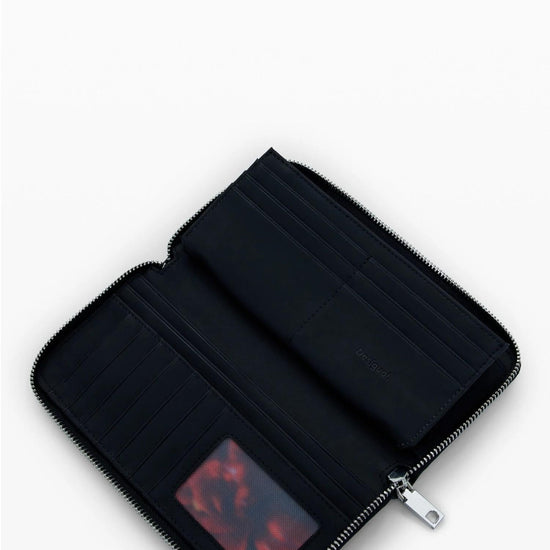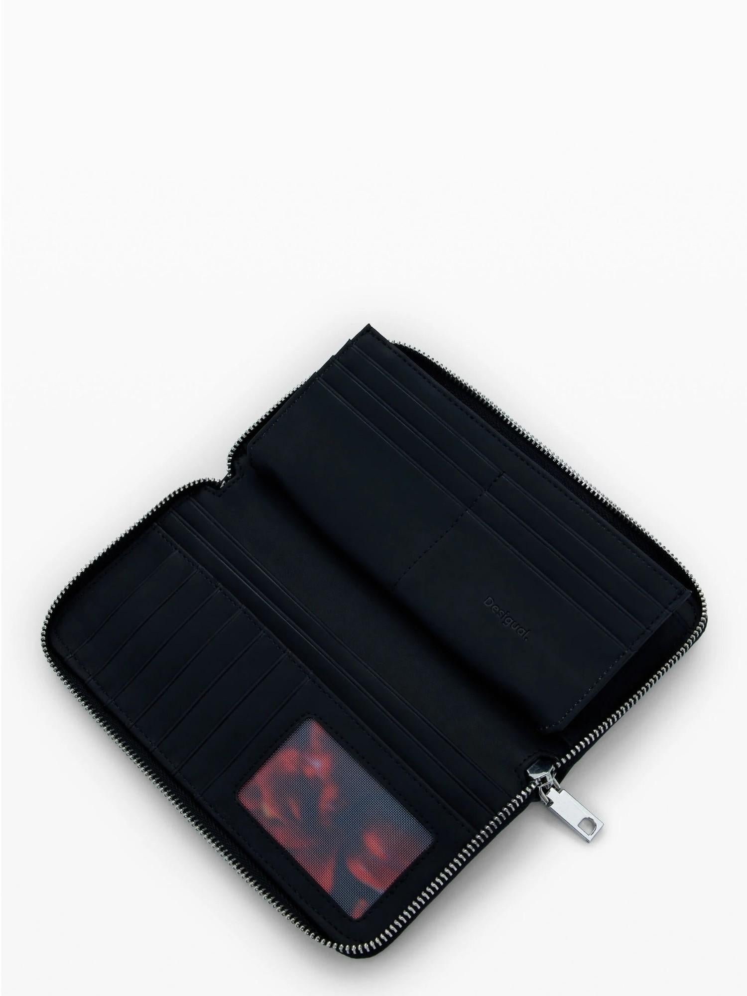 Large wallet in perforated leather-look fabric, floral print background, and decorative metal studs. Perforated fabric. Floral print lining. Zip closure. Multiple interior compartments. Metallic logo detail. Interior compartment. Leather-look. Designed in Barcelona. Dimensions: 20.5 x 2 x 10 cm. External composition: 100% polyurethane. Internal composition: 100% polyester. Trimming fabric material: 100% polyurethane.
