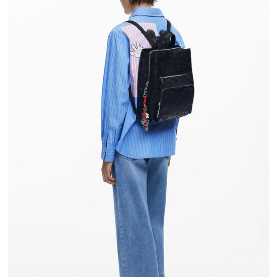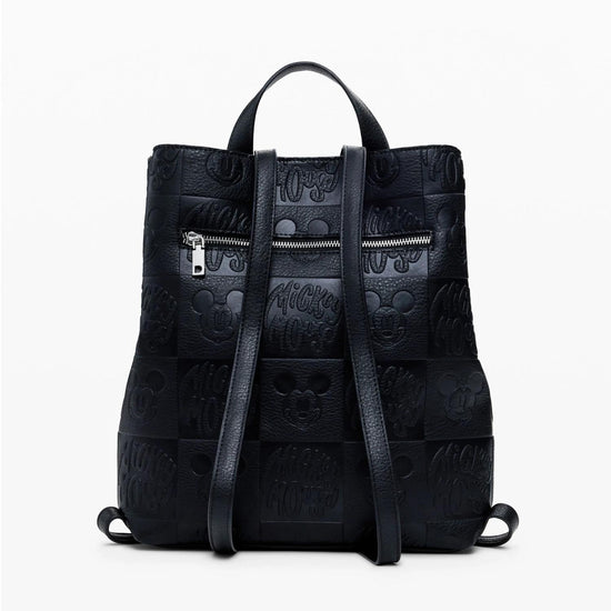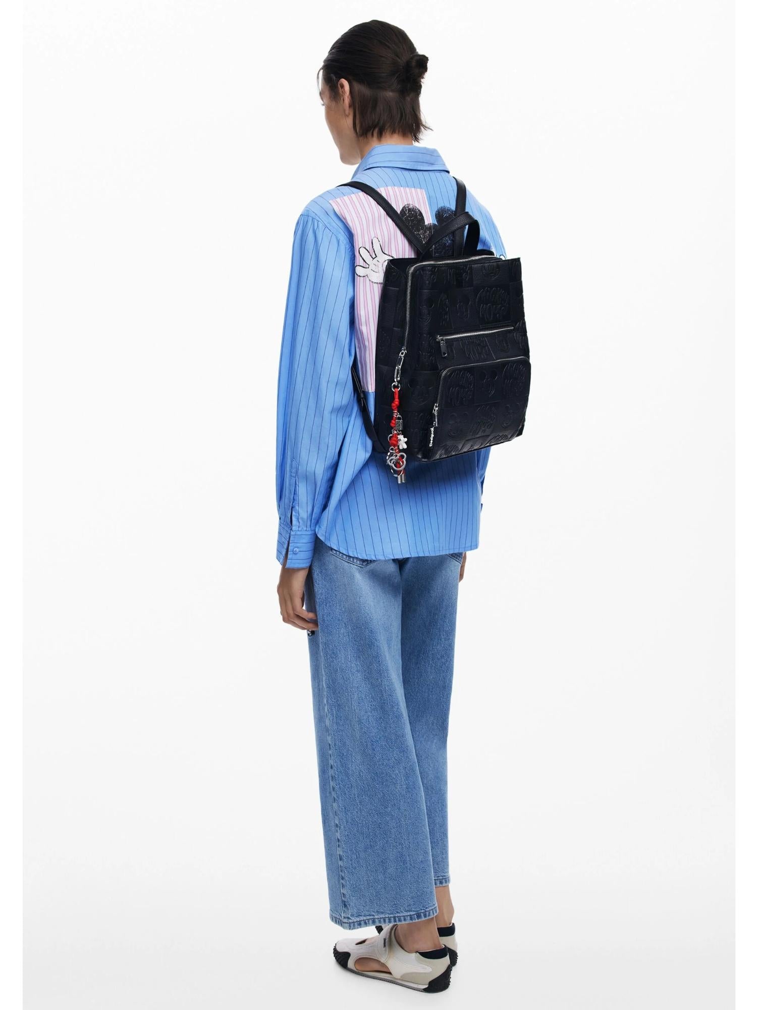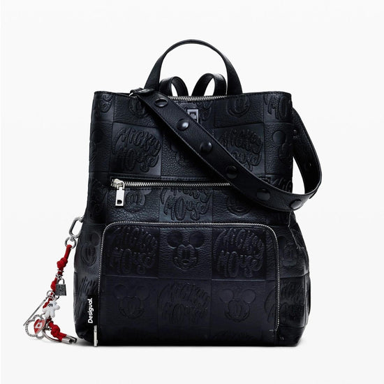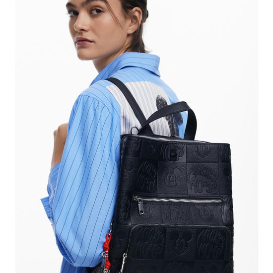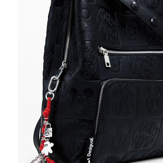 Medium faux leather backpack that converts into a handbag, with removable handles and 3D-effect details featuring Mickey Mouse motifs. 3D-effect engraving. Two external front pockets. External back pocket. Zip closure. Internal zip pocket. Removable handbag-style handle. Removable key ring. Printed lining. Leather effect. Designed in Barcelona. Licensed by: Disney. Dimensions: 27.50 x 10.20 x 33 cm. External composition: 100% polyurethane. Internal composition: 100% polyester. Trimming fabric material: 100% polyurethane.