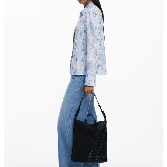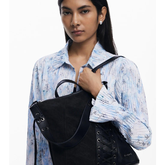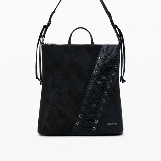 Zaino piccolo in effetto pelle, con dettaglio intrecciato effetto corsetto sulla parte anteriore e manico rimovibile per portare come borsa. Dettaglio intrecciato. Dettagli con occhielli metallici. Tasca posteriore esterna. Chiusura: con cerniera. Tasca interna con cerniera. Manico rimovibile tipo borsa. Effetto corsetto. Scomparto interno. Effetto pelle. Progettato a Barcellona. Misure: 30 x 10 x 30 cm. Composizione esterna: 100% POLIURETANO. Composizione interna: 100% POLIESTERE. Trimming fabric Material: 100% POLIURETANO.