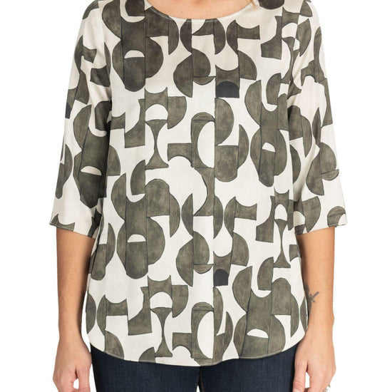 Women's blouse with wide neckline, 3/4 sleeves and geometric pattern