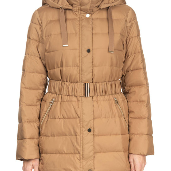 Medium-length quilted jacket, drawstring hood, high collar, elastic waistband.