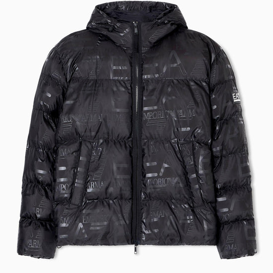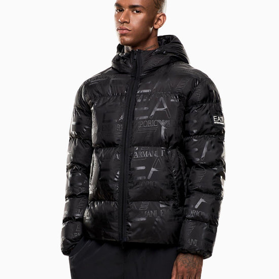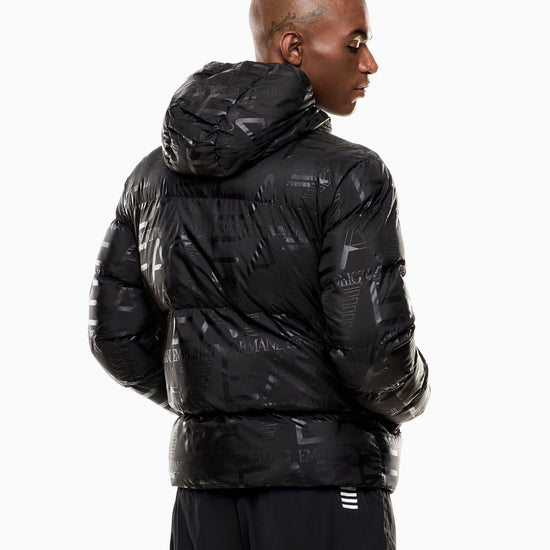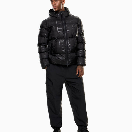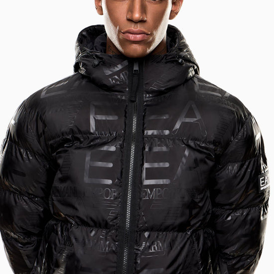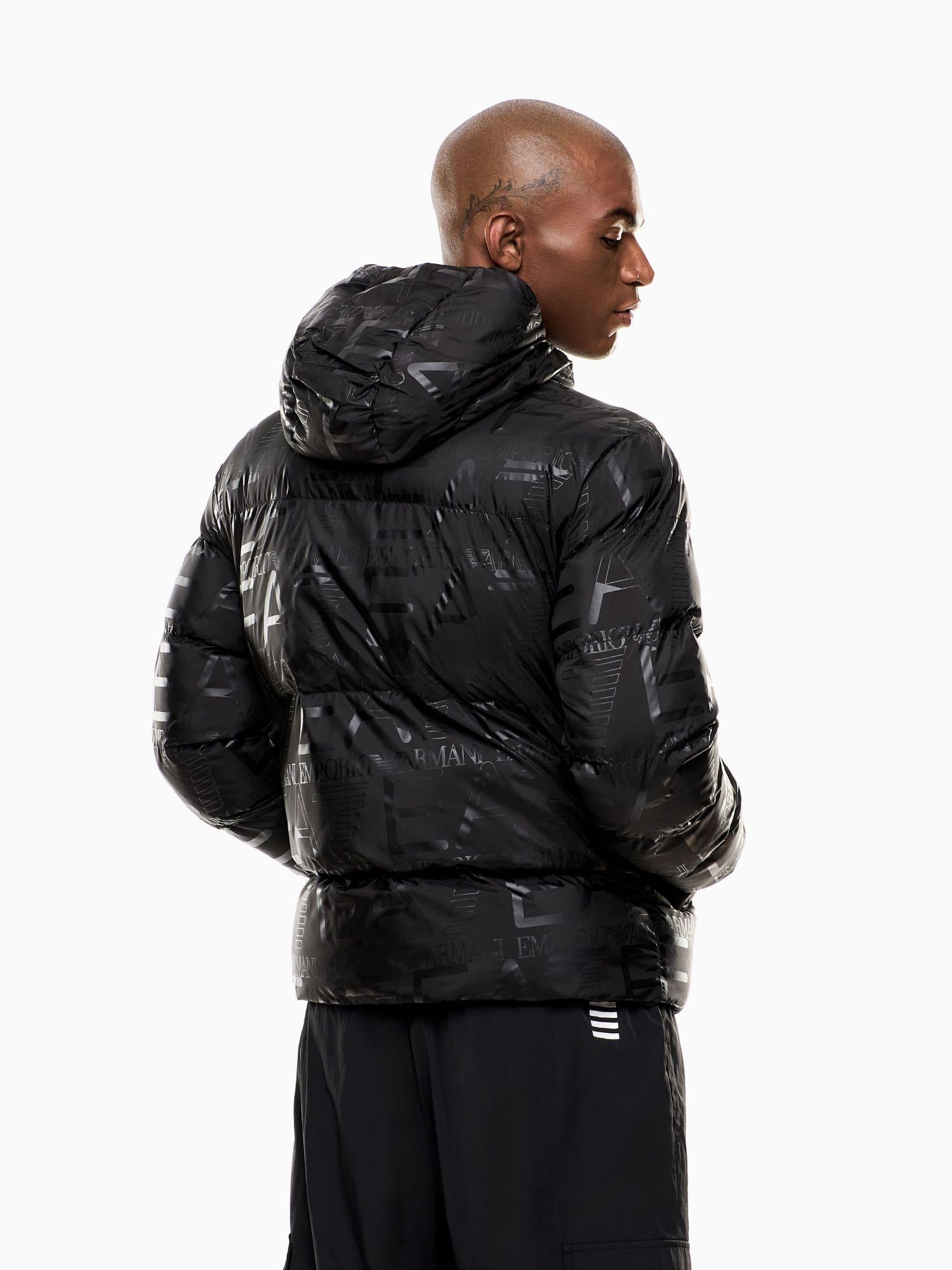 EA7 Emporio Armani Men's Hooded Padded Jacket with All-Over Logo Print in Black