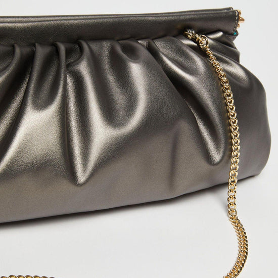 This glossy pouch catches the eye with its soft design and shiny gold chain detail. Perfect for carrying around town, it pairs well with coats and down jackets, adding a sophisticated touch to your outfits. Coated jersey pouch with a glossy finish. Snap closure with metal mechanism. Fabric-lined interior. Internal zip pocket. Removable metal chain shoulder strap. Dimensions: 35 x 11 x 17 cm. Polyester bag with polyurethane coating. Lining: 100% polyester.