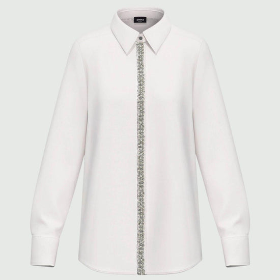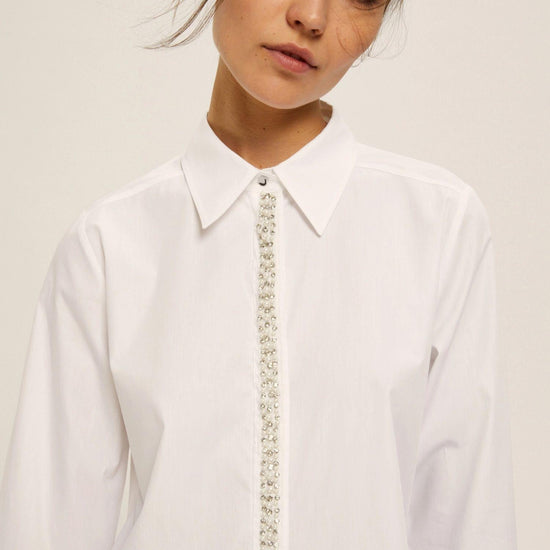 Sparkling beauty con questa camicia in popeline di puro cotone decorata da una graziosa passamaneria con perle e strass. Perfetta per l'ufficio con blazer e pantalone, sorprendente con i denim. Camicia in popeline di cotone. Fit regolare. Collo a camicia con abbottonatura nascosta. Dettagli in passamaneria con cristalli e perle. Composizione: 100% cotone (decorazioni escluse).