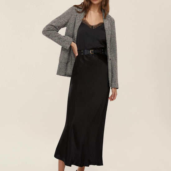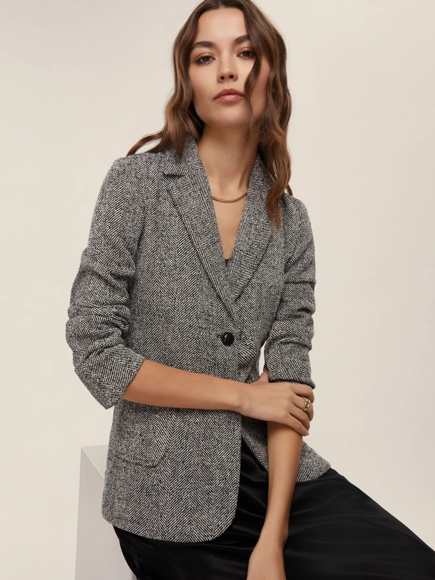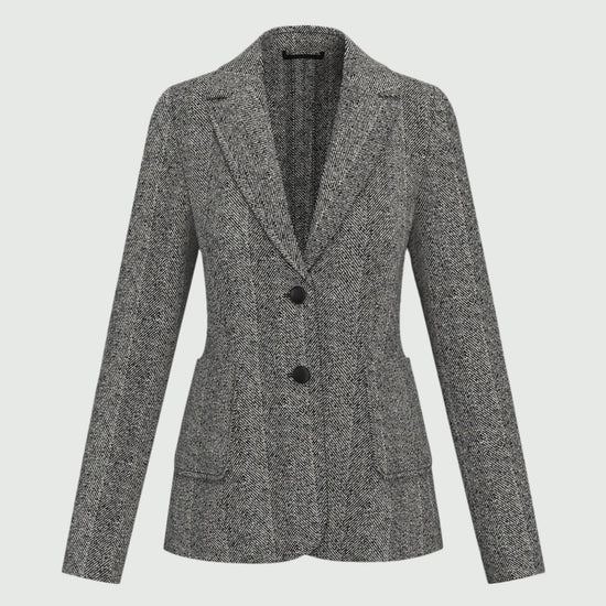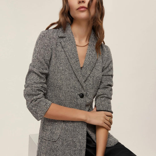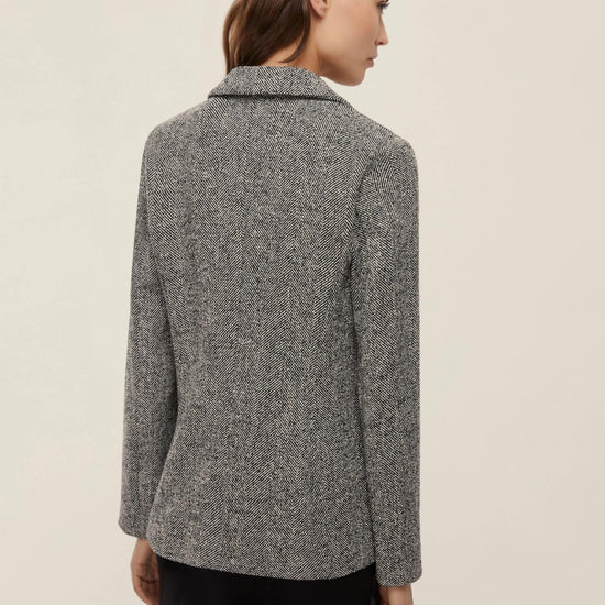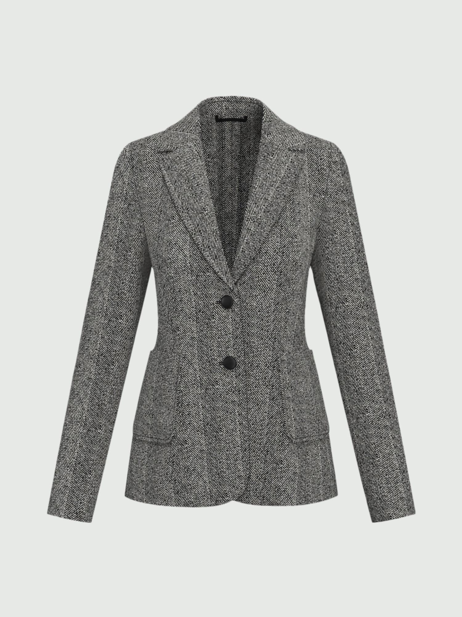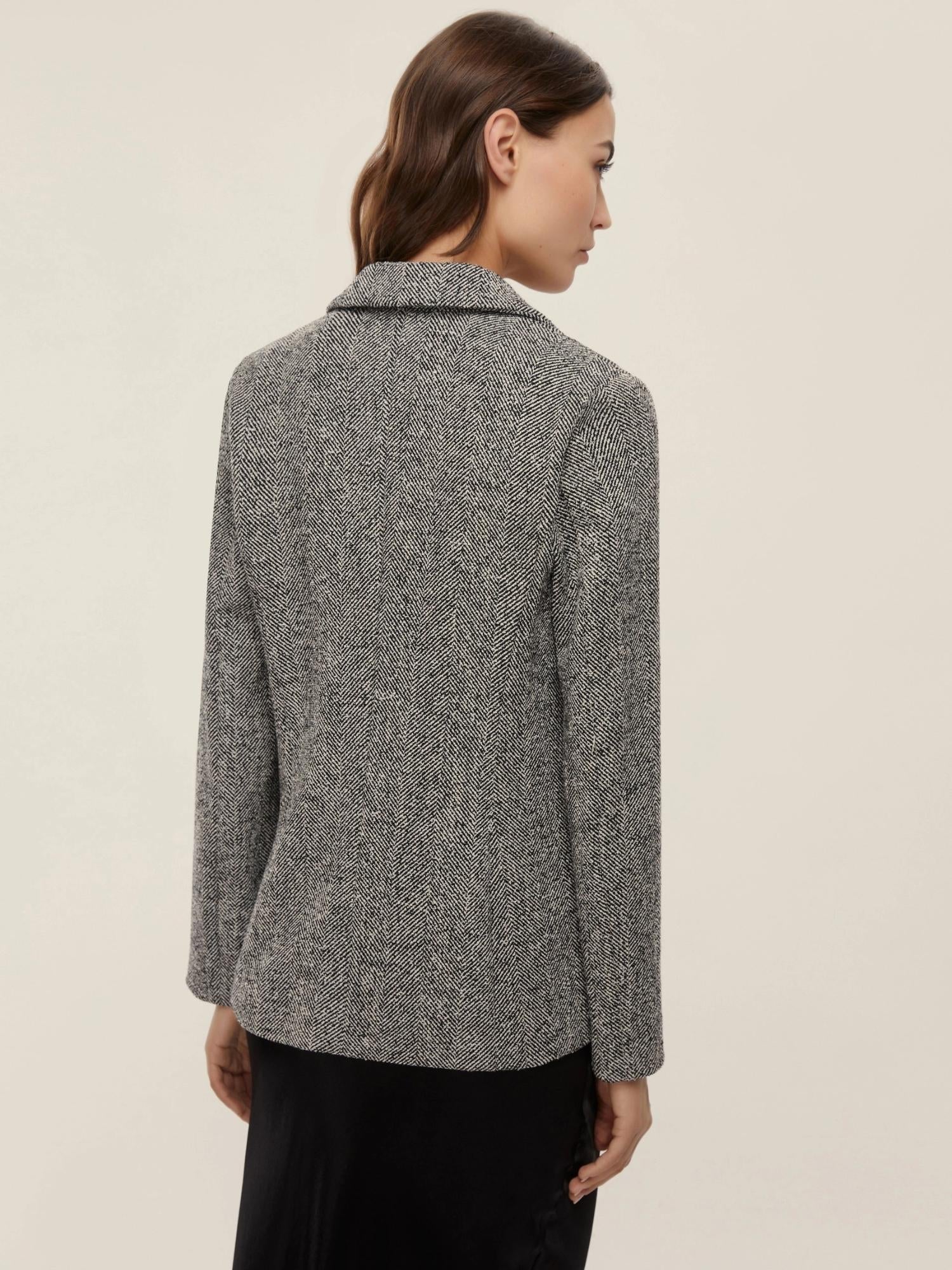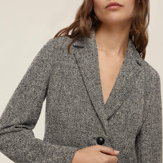 This woven jacket with a herringbone pattern in a stretch cotton blend exudes British charm and a feminine cut that elegantly accentuates the waist. The slightly tapered fit and lapel neckline define a refined silhouette, while the patch pockets with exposed stitching add a casual, contemporary touch. The two-button closure completes a refined and versatile design, ideal for wearing over a lingerie-style top for a modern, sensual contrast. Fabric: 56% polyester, 22% cotton, 21% viscose, 1% elastane.