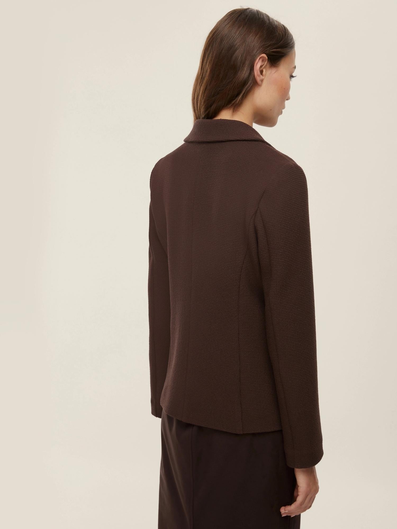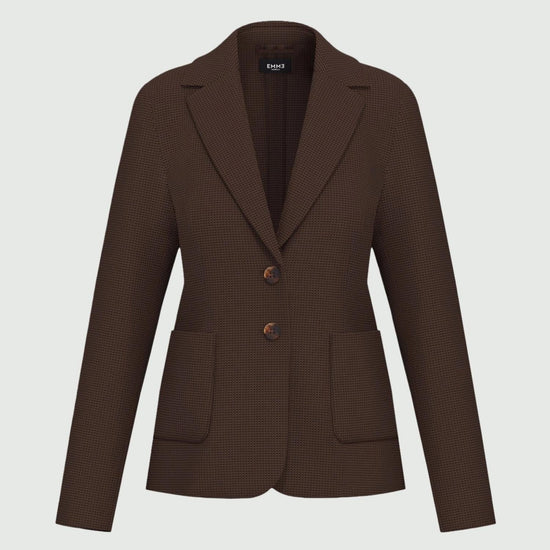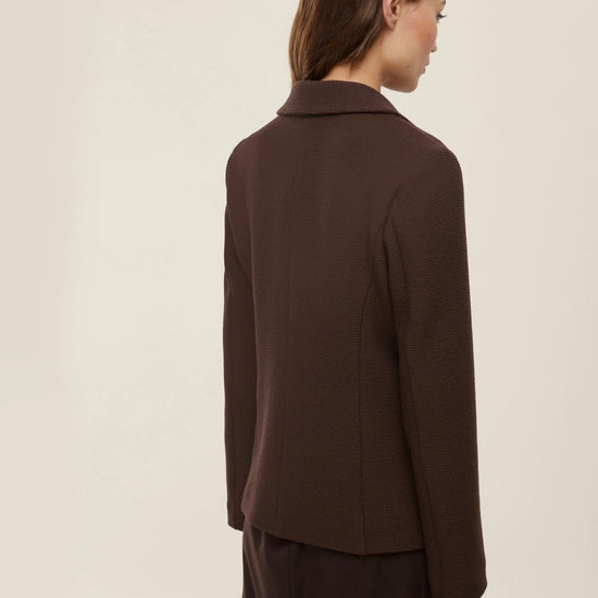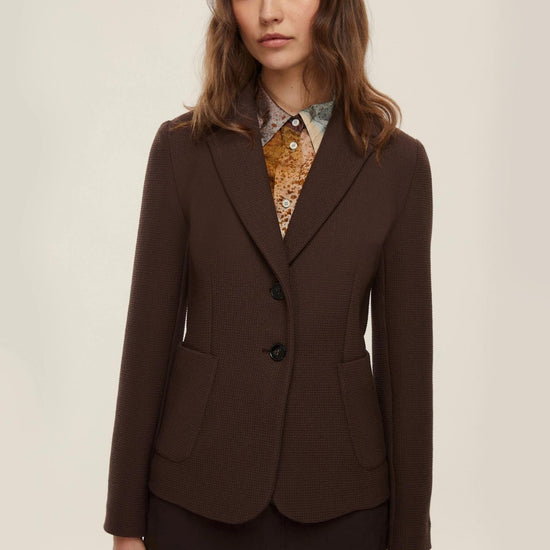 Formal jacket in a stretch viscose blend woven wicker, featuring a feminine fit that flatters the figure thanks to the slightly tapered silhouette and defined waist. The lapel neckline and two-button closure lend elegance and refinement, while the patch pockets with exposed stitching add a tailored touch. Perfect paired with a shirt and a pencil skirt for a sophisticated and timeless urban look. Fabric: 72% polyester, 27% viscose, 1% elastane.