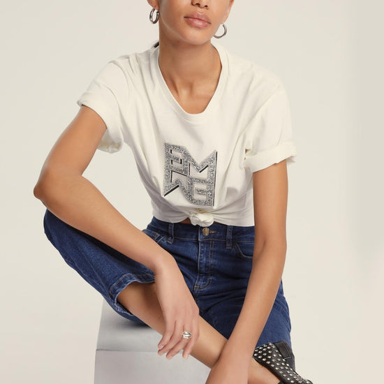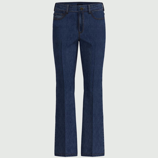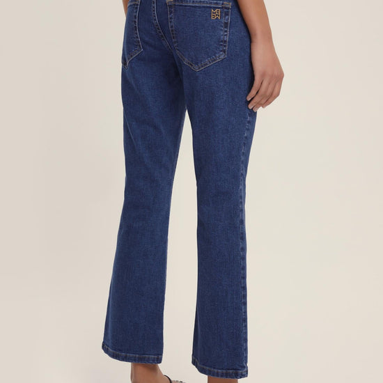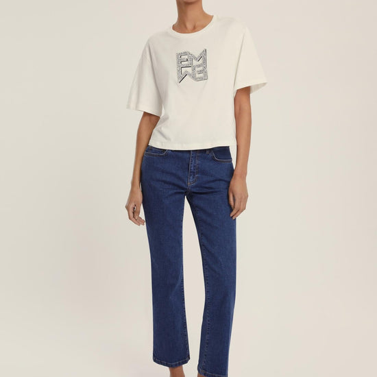 Fitted and cropped at the ankle, these are the youngest jeans in the collection: wear them with a simple t-shirt and ballet flats, or pair them with silk and a raincoat to face the new season in style. 5-pocket jeans in treated stretch cotton denim. Slim fit with a flared hem. Custom button and hidden zip closure. Emmergram embroidery on the back pocket and custom back label. Ironed crease front and back. Cropped length above the ankle. Composition and care: Machine wash max 30 degrees with reduced mechanical action; do not bleach; do not tumble dry; line dry in the shade; cool iron max 120 degrees C; do not dry clean; do not iron appliques; be careful with light-colored clothing and accessories as body heat may cause the denim fabric to bleed and cause stains. be careful when sitting on light-colored surfaces, especially when damp. wash denim separately and always turn inside out. hang the garment inside out, avoiding exposure to direct light. avoid removing isolated stains. 98% cotton, 2% elastane.
