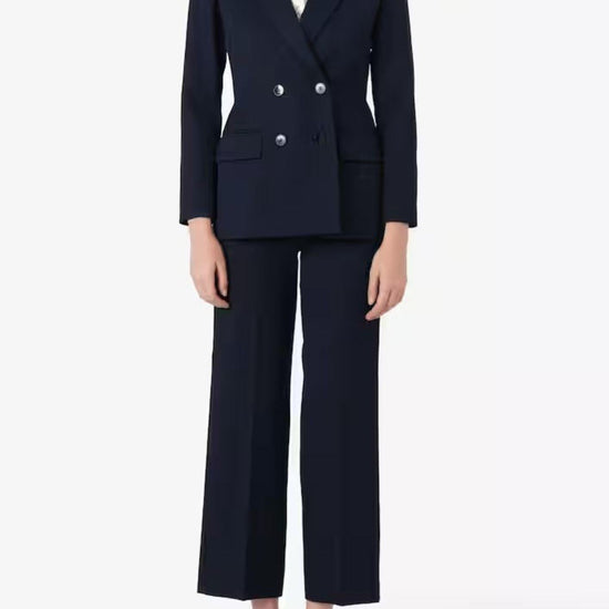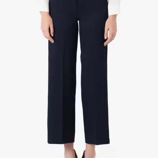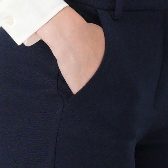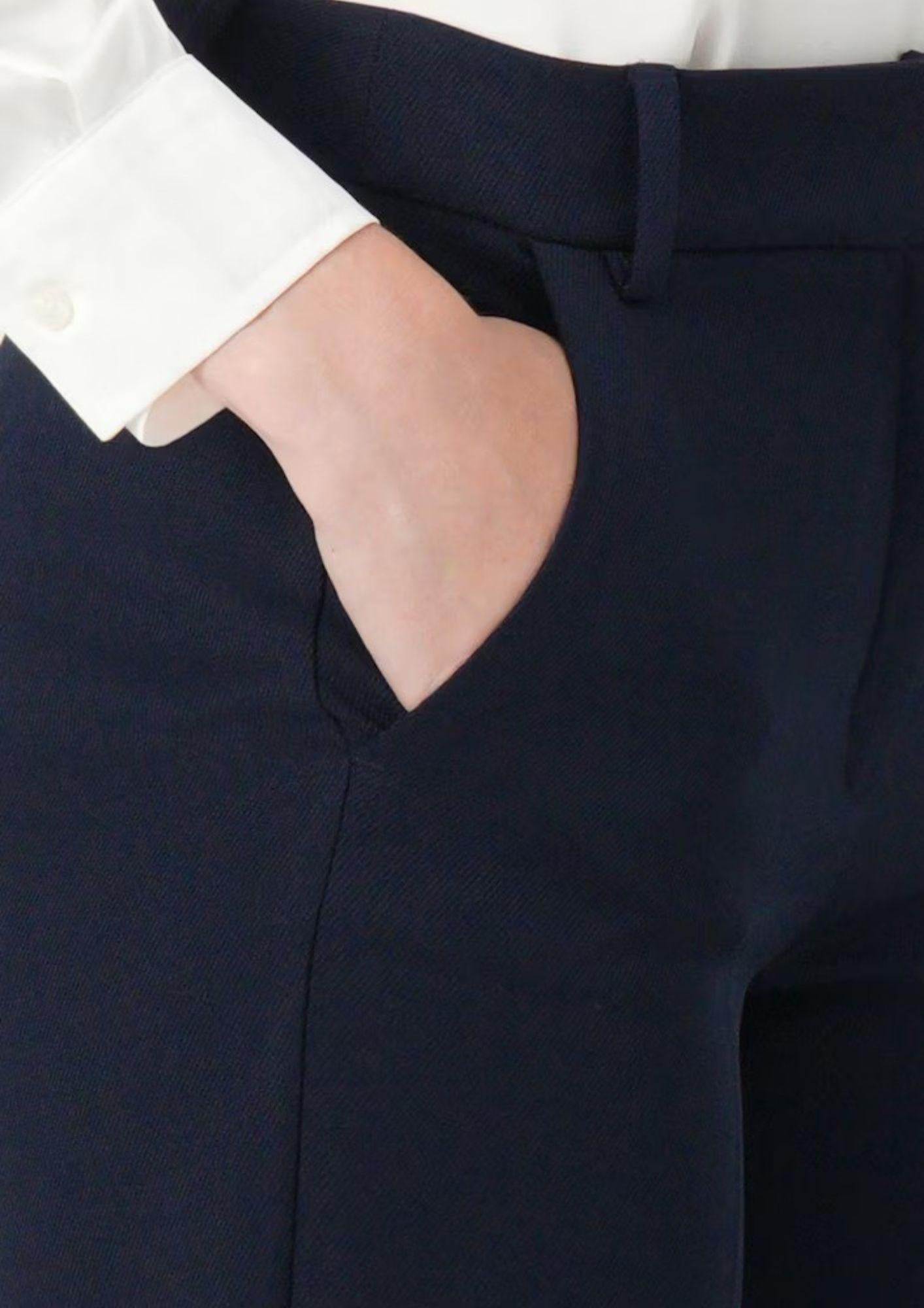 Trousers in stretch technical fabric with a diagonal weave, designed for comfort and freedom of movement without sacrificing casual elegance. The clean lines and subtle tailored details, such as the pressed pleat and welt pockets, make them ideal for refined city or office looks. Easy to pair with blouses and blazers, they are a versatile and timeless piece. Straight fit. Exposed button and hidden zip closure. Belt loops. Side slant pockets and rear welt pockets. Pressed pleat on front and back. Fabric: 91% polyester, 9% elastane.