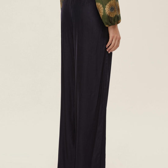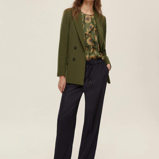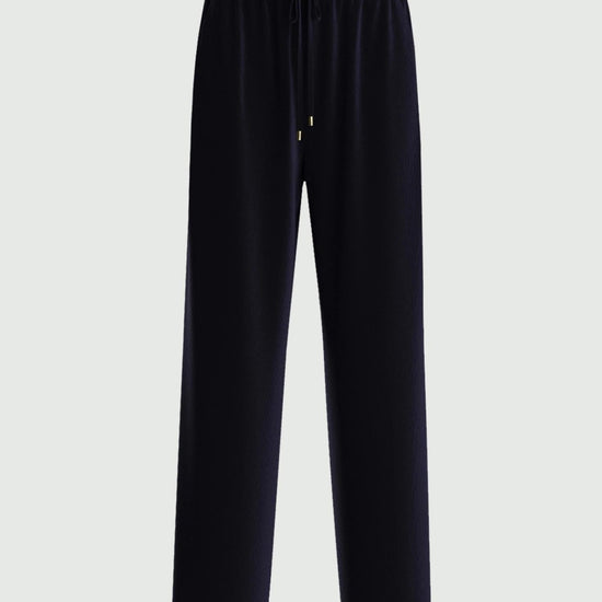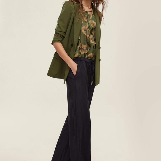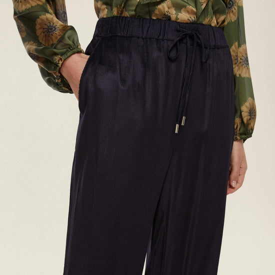Fluid, pinstriped velvet trousers in viscose and lyocell, featuring a soft feel and subtle sheen that lend elegance to even the most casual looks. The jogger design combines comfort and style thanks to the wide leg and elastic waistband with adjustable drawstring and metal ends. Side slash pockets complete the look, making it practical and refined. Perfect with a blazer for a sophisticated outfit or a sparkly sweater for evening. Wide leg. Elastic waistband with adjustable drawstring. Side slash pockets. Fabric: 69% viscose, 31% lyocell.