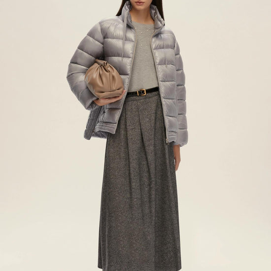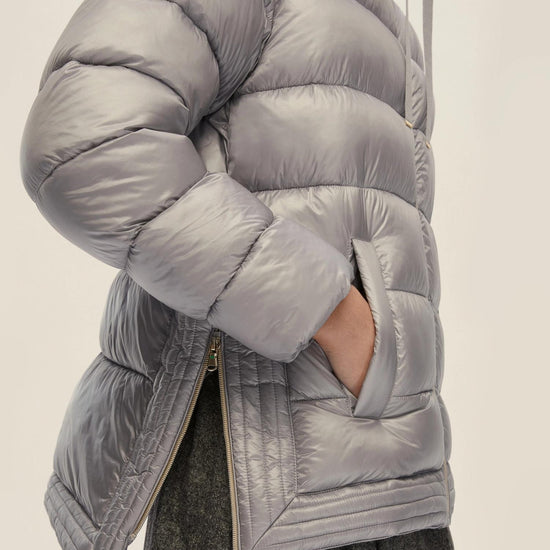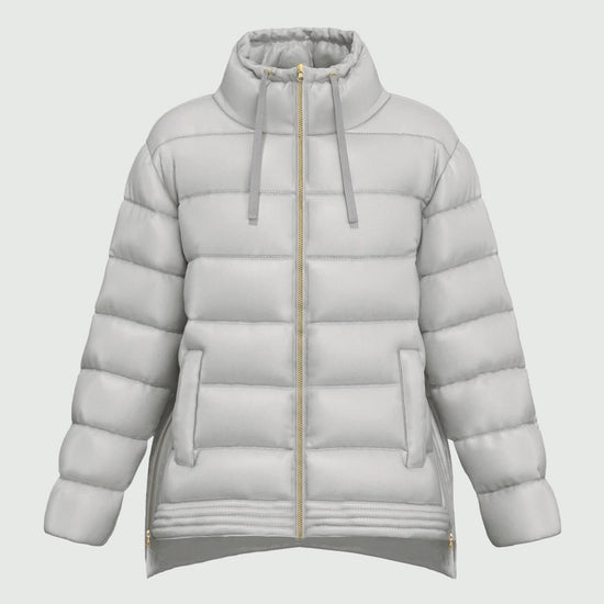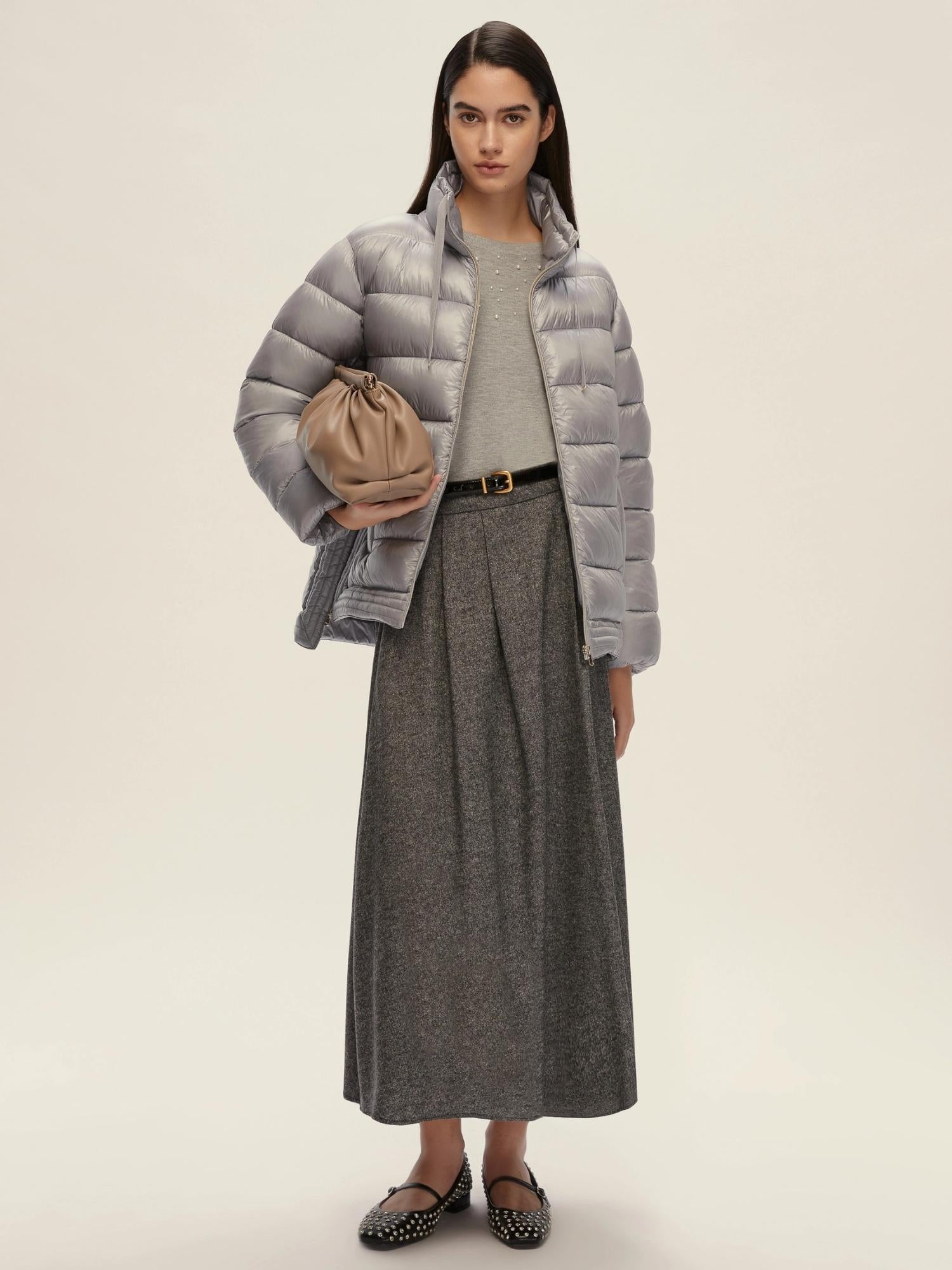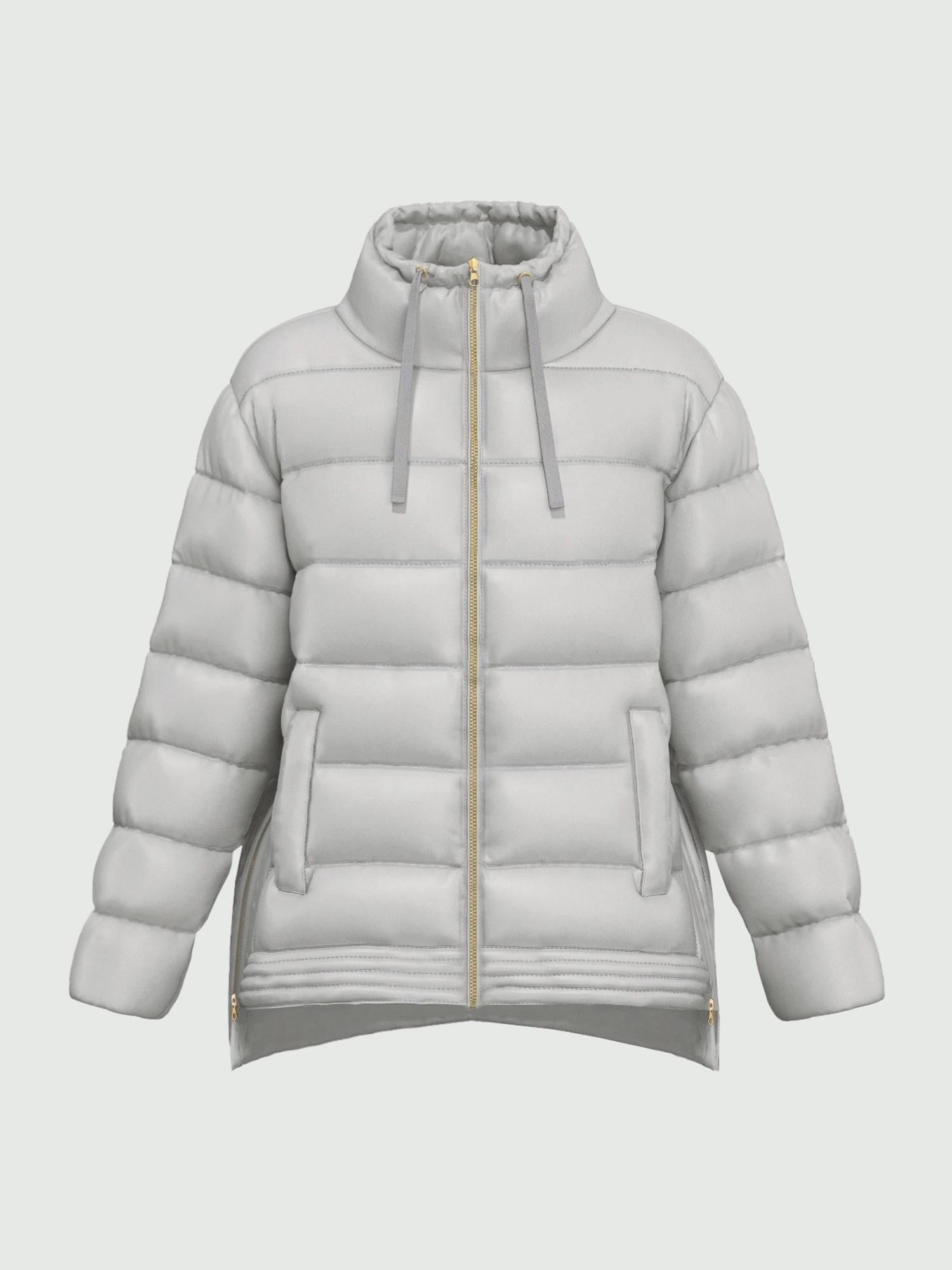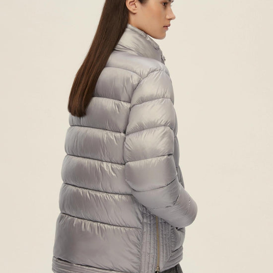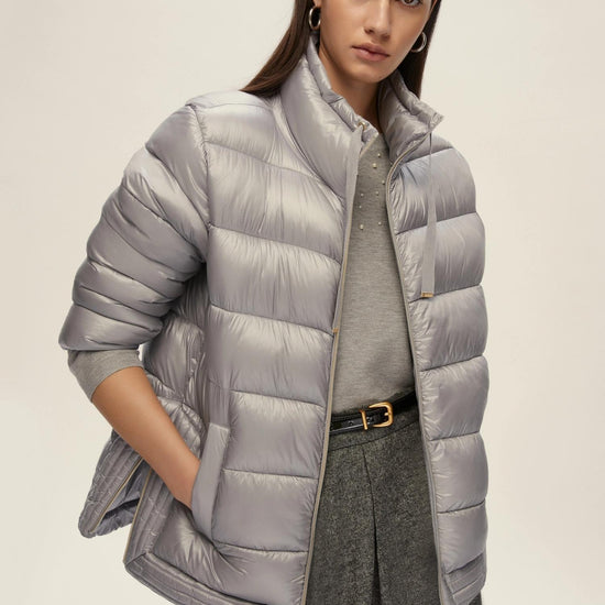 Women's water-repellent down jacket with a modern and functional design, perfect for facing cold days in style. Crafted from water-repellent downproof technical canvas, it guarantees protection and lightweight comfort thanks to its slightly flared fit that follows your movements naturally. The high neck with drawstring and side zips add an active touch and greater practicality, while the horizontal quilting and topstitching at the hem lend a contemporary and feminine look. Slightly flared fit. High neck with drawstring. Exposed zip closure and zips on the side slits. Fabric: 100% Polyamide. Lining: 100% Polyamide. Padding: 100% Polyester.