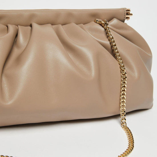 This glossy pouch captures the eye with its soft design and sparkling gold chain detail. Perfect for carrying around town, it pairs well with coats and down jackets, adding a touch of sophistication to your outfits. Coated jersey pouch with a glossy finish. Snap closure with metal mechanism. Fabric lining. Internal zip pocket. Removable metal chain shoulder strap. Dimensions: 35 x 11 x 17 cm. Composition and care instructions: Polyester bag with polyurethane coating; lining: 100% polyester.