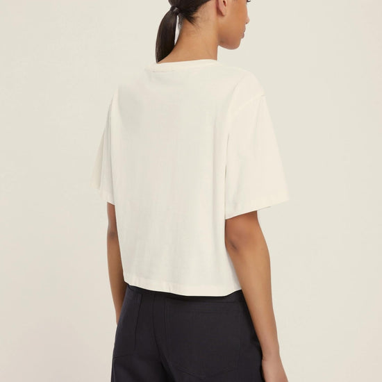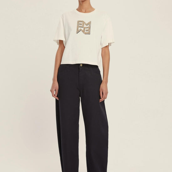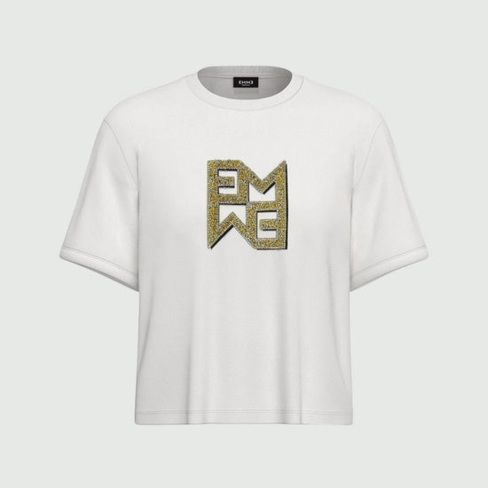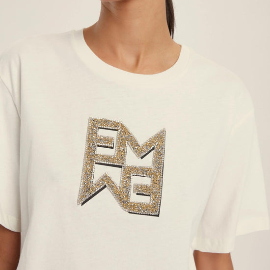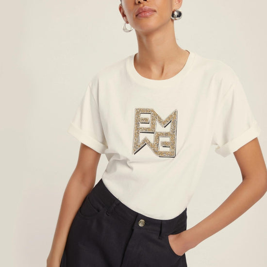 Versatile and chic by definition, the boxy t-shirt becomes the protagonist of everyday looks thanks to the monogram motif with crystal appliques. Everyday glamour. Pure cotton jersey t-shirt. Boxy fit. Round neckline with ribbed trim. Short sleeves with dropped shoulders. Emmegram logo printed on the front with crystal appliques. Fabric: 100% Cotton.