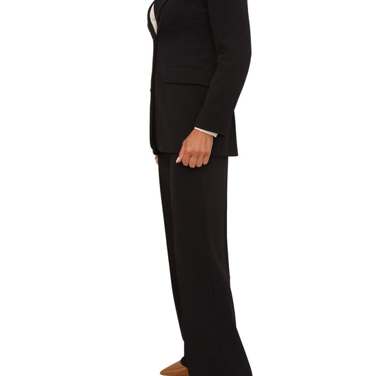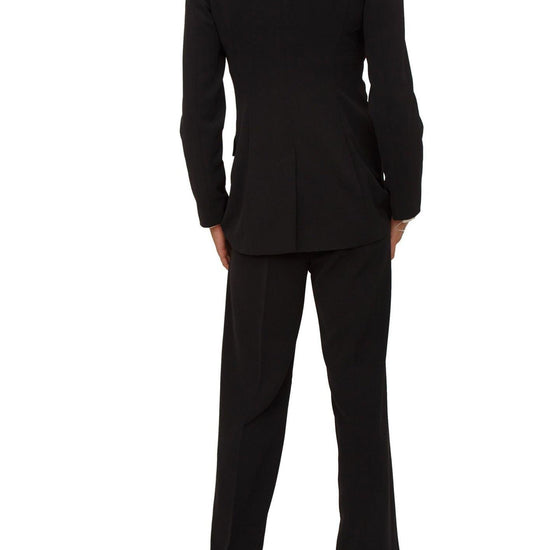 Scollo con rever e chiusura monopetto, tasche con patta e fodera interna, pantalone dritto, piega stirata fronte e retro. Tessuto: 95% Poliestere, 5% Elastan