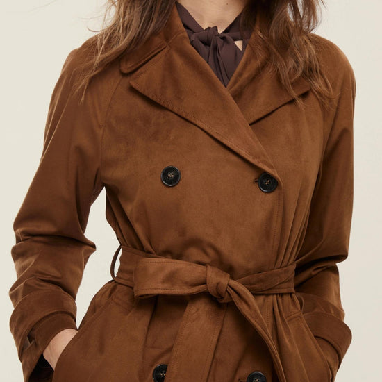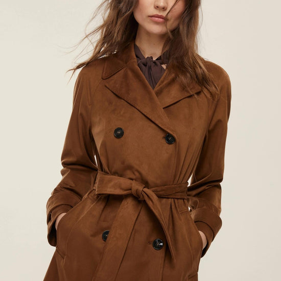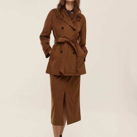 Face the transitional season with this new soft jersey trench coat. The double-breasted tailored fit and belted waist define a bold silhouette, perfect for pairing with the matching skirt. Jersey trench coat with a smooth, soft feel. Straight fit. Lapel collar. Double-breasted button and belt closure. Long raglan sleeves with toggle cuffs. Side welt pockets. Fabric: 88% Polyester, 12% Elastane.
