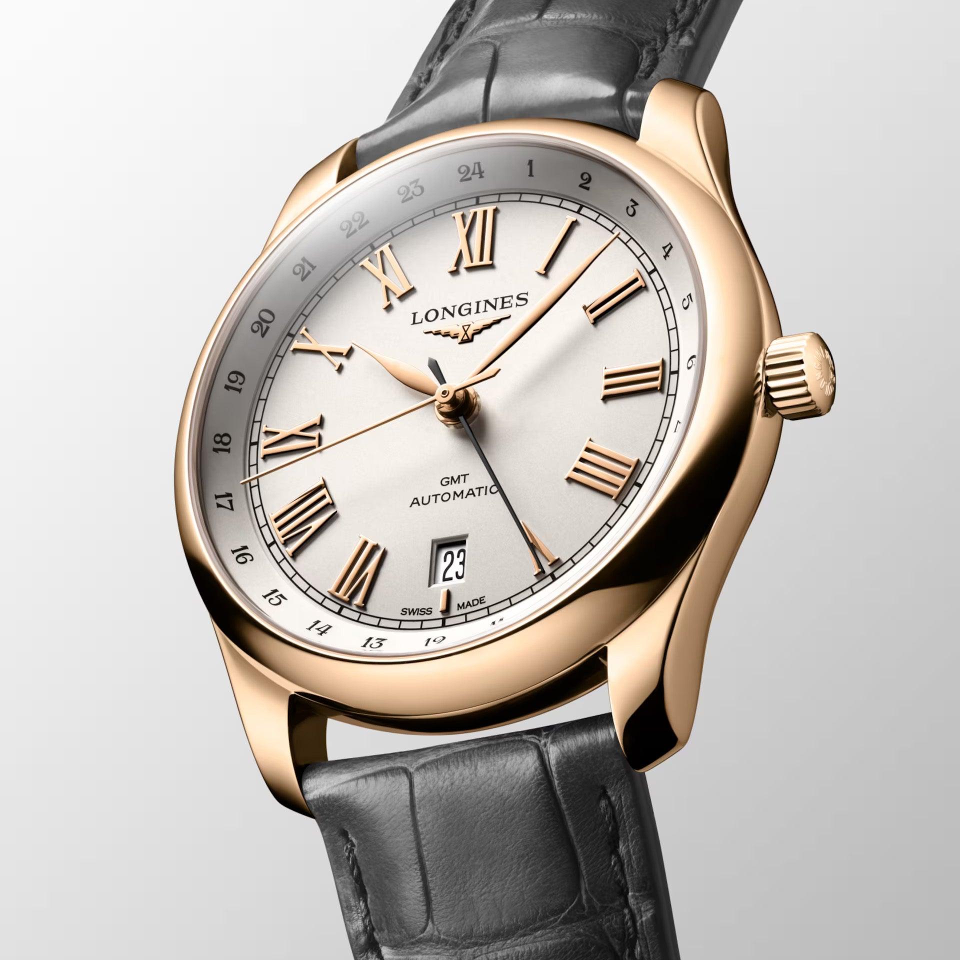 Sul quadrante argentato givré spiccano la scala 24 ore in numeri arabi decalcati, la minuteria chemin de fer, gli undici numeri romani applicati dorati e la finestrella della data a ore 6. Le lancette a foglia dorate indicano l’ora, mentre la lancetta GMT nera riprende la tonalità dei numeri della scala 24 ore. Questo modello Longines Master Collection GMT s’indossa con un cinturino in pelle grigia antracite con fibbia ad ardiglione in oro rosa.