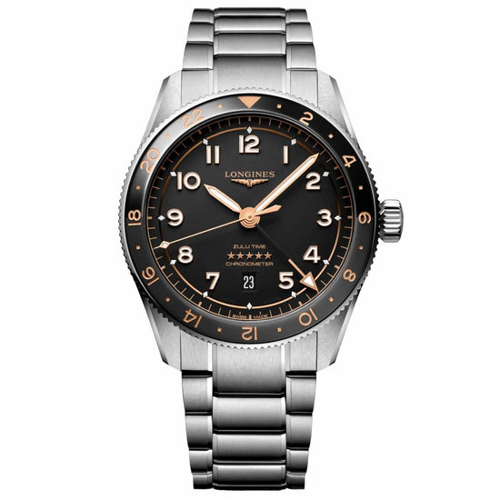Il LONGINES Spirit Zulu Time simboleggia la maestria centenaria del marchio negli orologi con più fusi orari. Le sue origini e il suo nome derivano dal primo orologio da polso LONGINES con due fusi orari, realizzato nel 1925, che presentava la bandiera Zulu sul quadrante (dove Zulu si riferisce alla lettera “Z” che indica il tempo universale per gli aviatori). Esteticamente, il LONGINES Spirit Zulu Time si distingue per l’esecuzione meticolosa e la particolare cura dei dettagli. Presenta una lunetta girevole bidirezionale con inserto in ceramica. Ogni modello è alimentato da un esclusivo calibro LONGINES, dotato di un bilanciere-spirale in silicio, resistente ai campi magnetici e certificato come cronometro COSC.