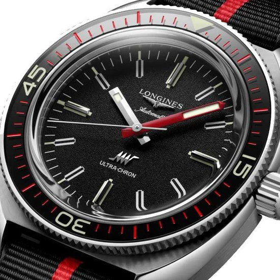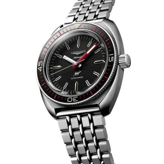 Ispirandosi al Longines Ultra-Chron Diver originale del 1968, questo modello con calibro ad alta frequenza è una reinterpretazione che celebra l’approccio pionieristico di Longines nel mondo del cronometraggio sportivo, che da sempre distingue la Maison. Il nuovo Longines Ultra-Chron saprà conquistare sia gli appassionati di orologi vintage che gli amanti dell’alta tecnologia. Il modello esibisce un bracciale in acciaio ed è consegnato all’interno di uno speciale cofanetto contenente un cinturino NATO nero realizzato a partire da materiali riciclati.