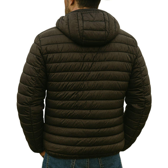 Men's down jacket with hood, central zip closure, two zip pockets on the sides. 100% nylon exterior, 100% nylon lining, 100% polyester padding.