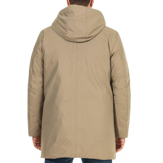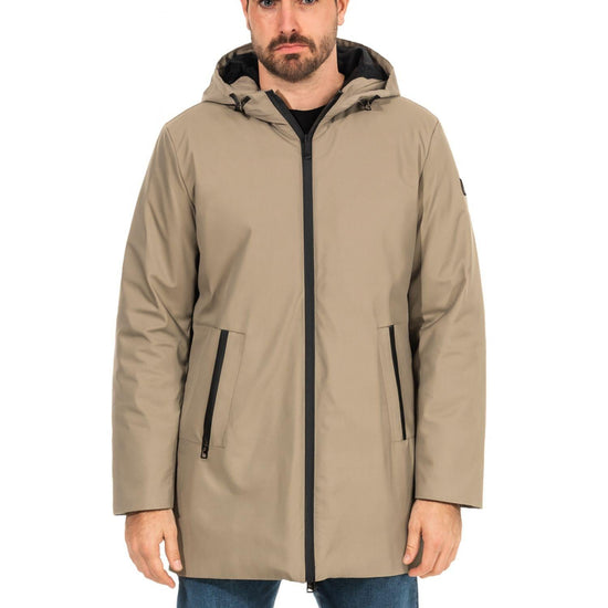 Parka uomo in softshel, cappuccio con coulisse, zip di chiusura centrale, due tasche con zip sui fianchi