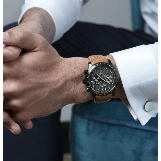 L’orologio Multifort Chronograph Adventure offre una leggibilità ottimale grazie ai suoi indici applicati e alle lancette scheletrate ricoperte di Super-LumiNova color sabbia. Il cinturino in pelle, con la sua patina, e la cassa grigio scuro conferiscono a questo segnatempo un look elegante e al contempo adatto alle attività all’aria aperta. Il particolare movimento di questo orologio non solo è automatico, ma include anche un cronografo.