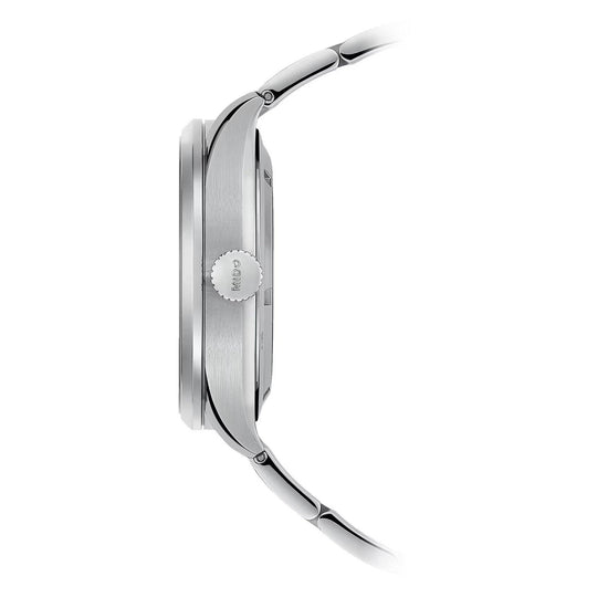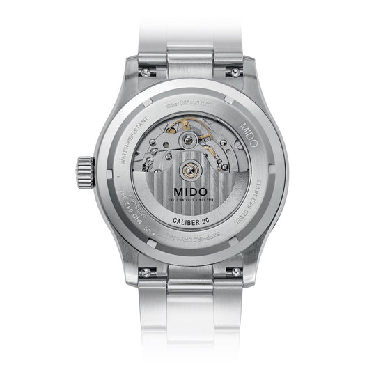 Sul quadrante sfumato del Multifort M, una finitura satinata verticale richiama le Côtes de Genève caratteristiche della collezione. L'immacolata Super-LumiNova® crea contrasto e leggibilità sulle lancette e sugli indici rotondi. La leggendaria robustezza del Multifort batte al ritmo del famoso Calibro 80. La sua riserva di carica fino a 80 ore è abbinata a una spirale in Nivachron™, un materiale rivoluzionario che offre una precisione formidabile. MIDO propone il Multifort M con un sistema di cambio del cinturino senza attrezzi, in versione acciaio o tessuto su base di gomma.