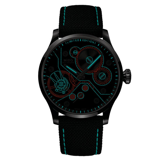 MIDO trasforma l'eccellenza orologiera in uno spettacolo di luce. Sul quadrante color antarcite del nuovo Multifort Mechanical, il Super-LumiNova® traccia la forma dei componenti del calibro sia di giorno che di notte. Capolavoro di 44 mm di diametro, questa edizione limitata celebra il 90° anniversario della collezione Multifort. Un robusto corpo in acciaio con finiture lucide e satinate ospita un fondello aperto per mostrare il suo squisito e intricato movimento meccanico svizzero, con calibro a carica manuale. Due cinturini aggiuntivi intercambiabili completano questo magnifico orologio, che diventa così un simbolo dell'esperienza di MIDO.