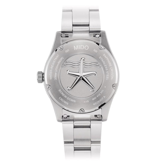 Esplora le terre e i mari con stile grazie al versatile e resistente Mido orologio Ocean Star. Con il suo diametro di 39 mm e l'eccezionale sottigliezza, questo orologio automatico è il compagno ideale per le tue avventure. Il quadrante unico e distintivo richiama le onde del mare, mentre il famoso motivo della stella marina simbolo di impermeabilità è presente sul fondello a vite. Impermeabile fino a 200 m, un vero simbolo di affidabilità e competenza di MIDO.