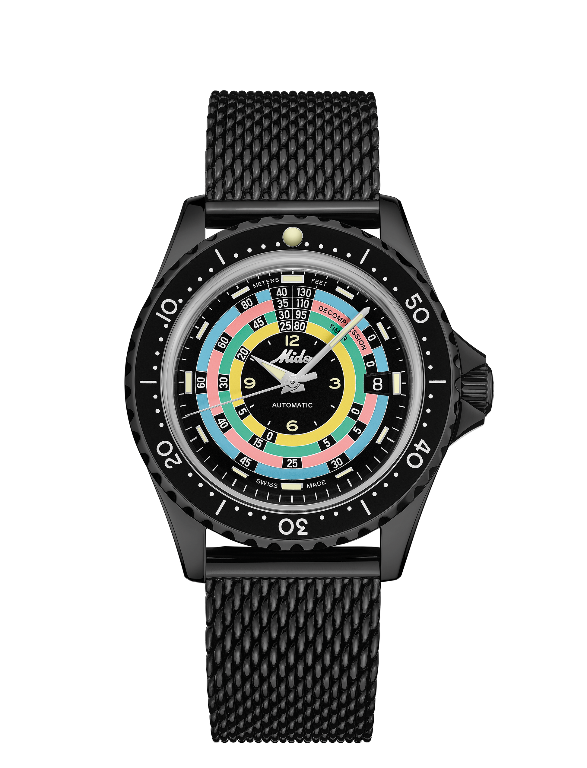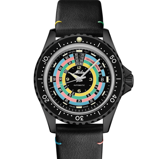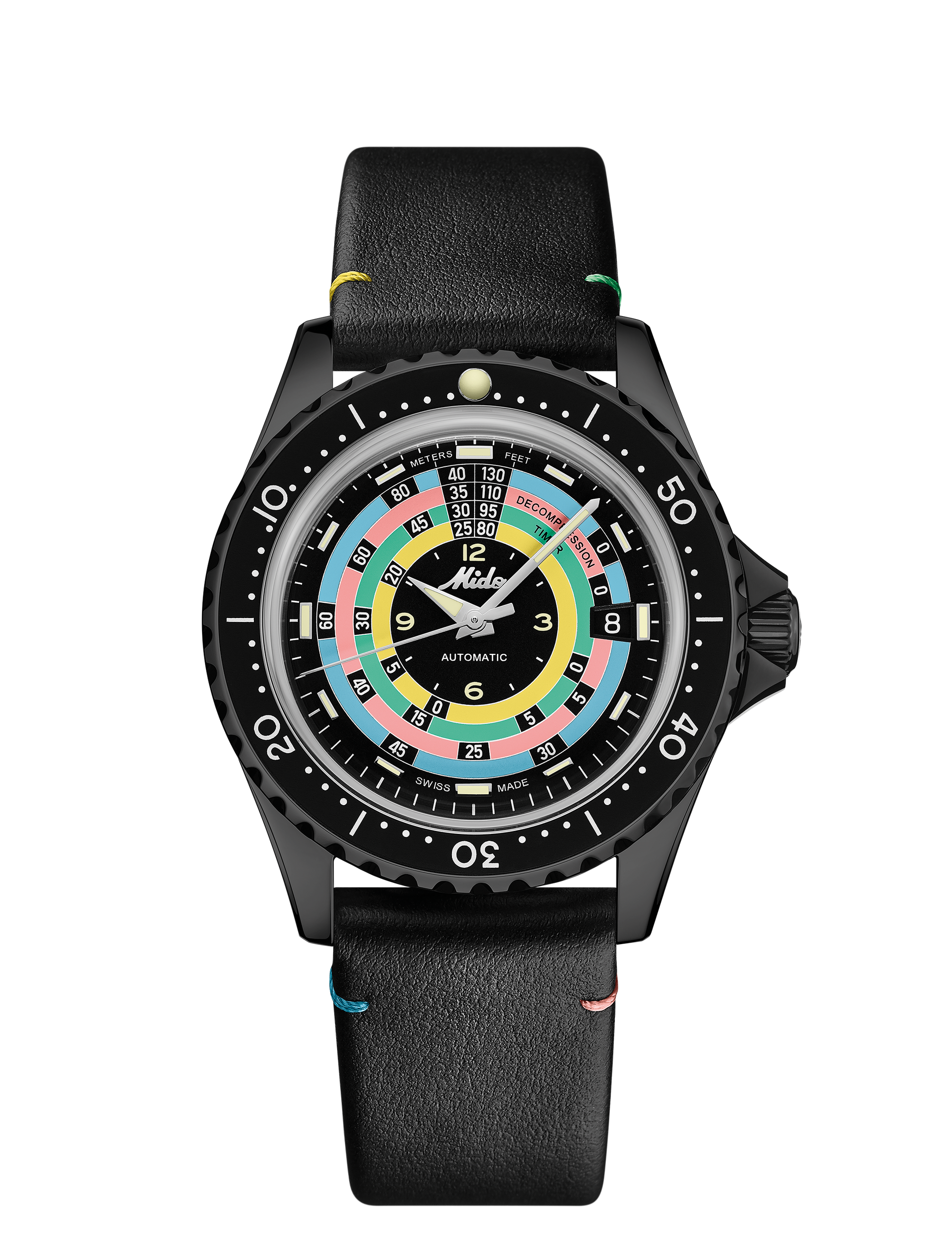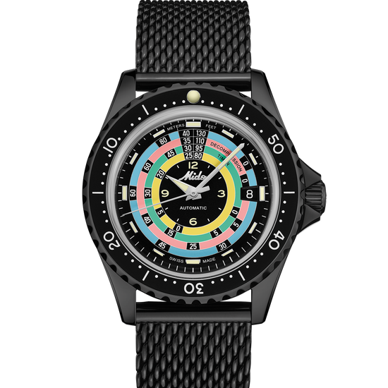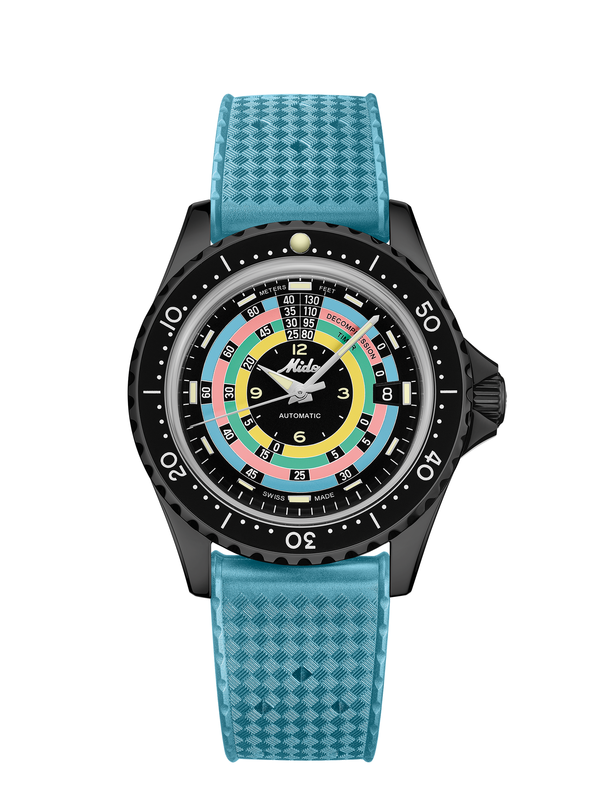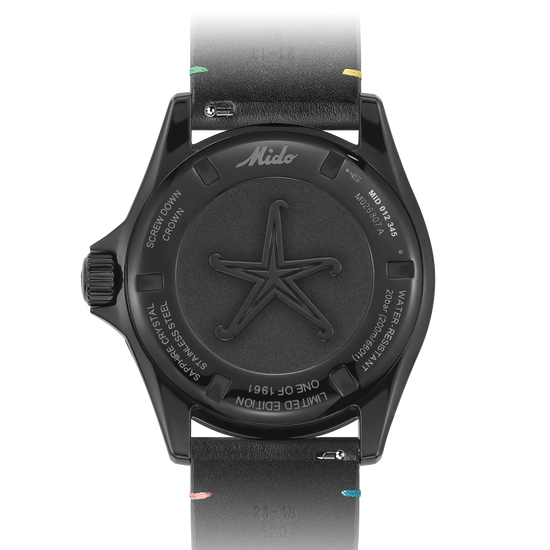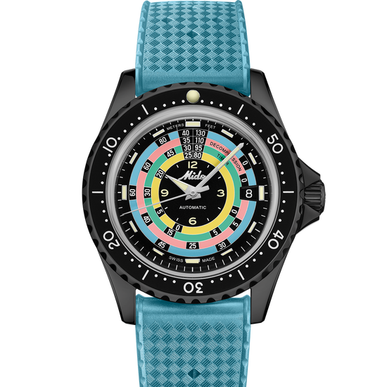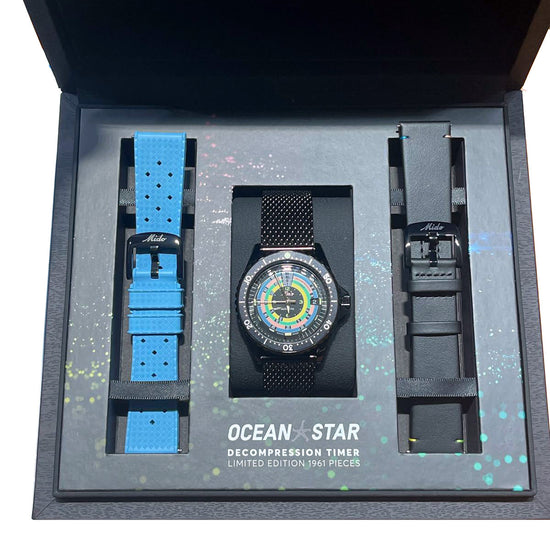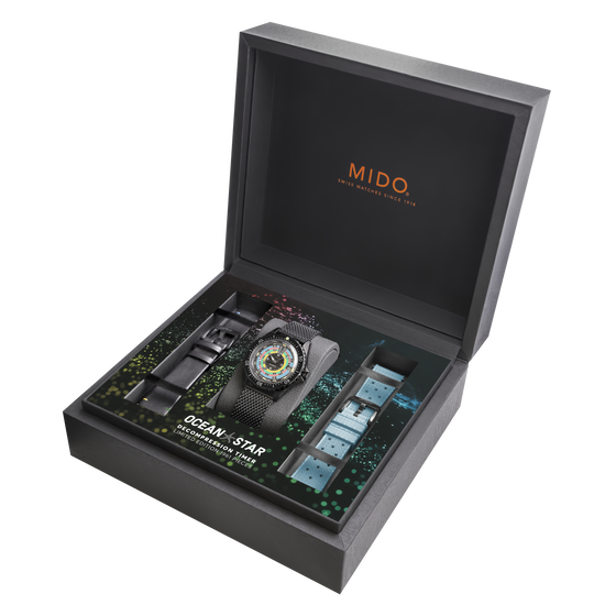 L'Ocean Star Decompression Worldtimer in edizione limitata 1961 di Mido ha uno stile irresistibile, colori vivaci e tecnologia all'avanguardia. Con funzione GMT e una stella marina incisa sul fondello a vite, questo orologio automatico svizzero è impermeabile fino a 200 m. Con Super-LumiNova®, vetro zaffiro e un cinturino aggiuntivo facilmente sostituibile, è perfetto per gli intenditori che cercano nuovi orizzonti.