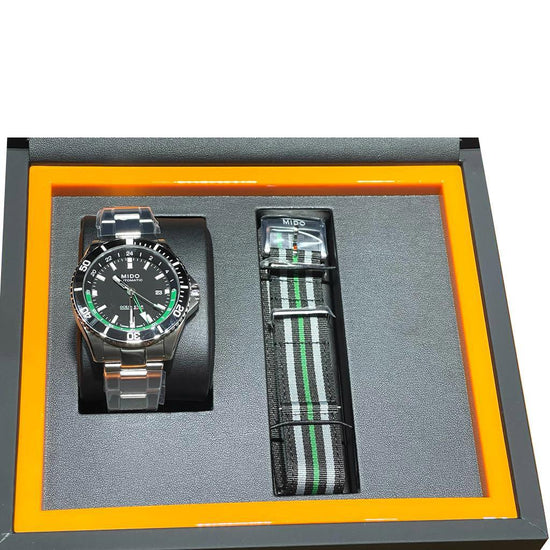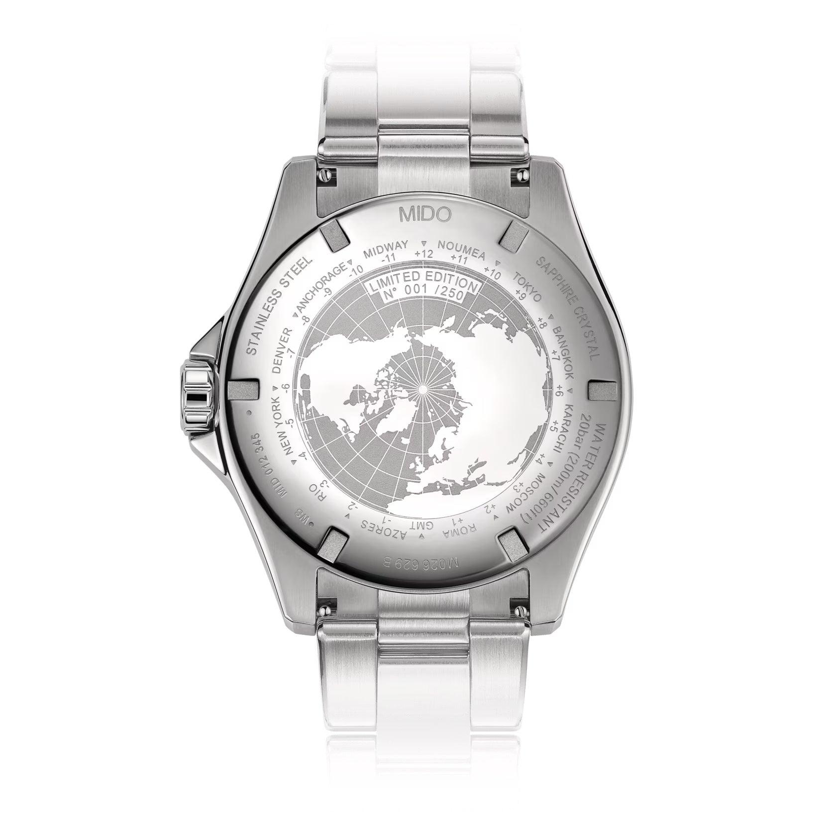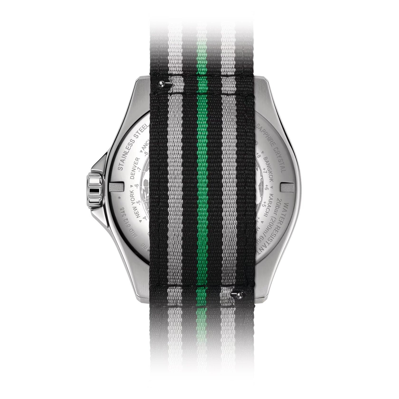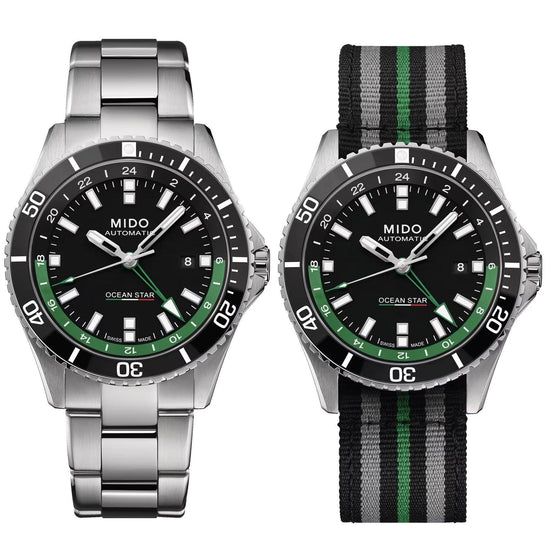MIDO arricchisce la sua collezione Ocean Star con una versione dotata della funzione GMT molto pratica. Visualizza chiaramente l'ora in due diversi fusi orari: l'ora di casa e l'ora locale. Sul retro dell'orologio - dotato di calibro 80, che offre una riserva di carica fino a 80 ore - MIDO ha inciso le indicazioni del fuso orario. La funzione GMT estremamente facile da usare offre il doppio della libertà per coloro che si trovano nel bel mezzo dell'oceano o di un'avventura adrenalinica.