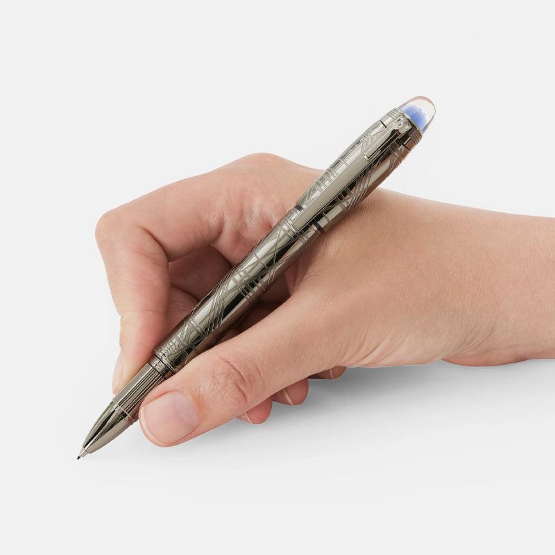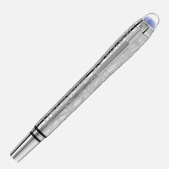 Starwalker SpaceBlue si spinge oltre il Pianeta Terra per rivolgere lo sguardo verso le stelle e la galassia. Decisamente maschile e futuristica, questa nuova collezione StarWalker presenta un nuovo look per il corpo e il cappuccio in metallo, con un design che ricorda i motivi complessi della Struttura di Widmanstätten, una delle creazioni più ipnotiche della natura. Tutte le parti in metallo presentano una finitura rutenio scuro, mentre la cupoletta sulla parte superiore del cappuccio di un intenso colore blu spazio, nella quale fluttua l’emblema Montblanc, richiama le tonalità di un cielo stellato.