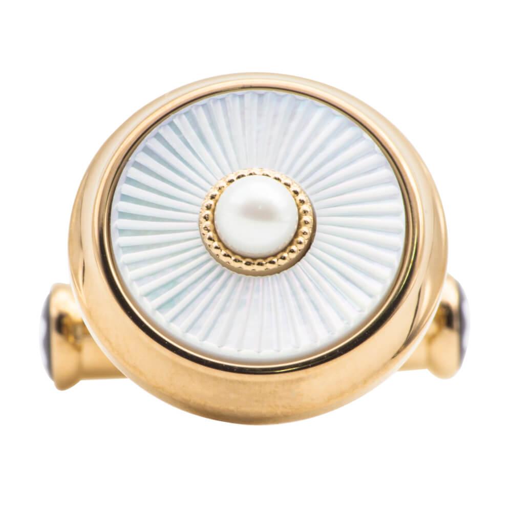 The cufflinks are made of stainless steel with a gold-tone PVD coating. The inlays are made of mother-of-pearl with a guilloche pattern.