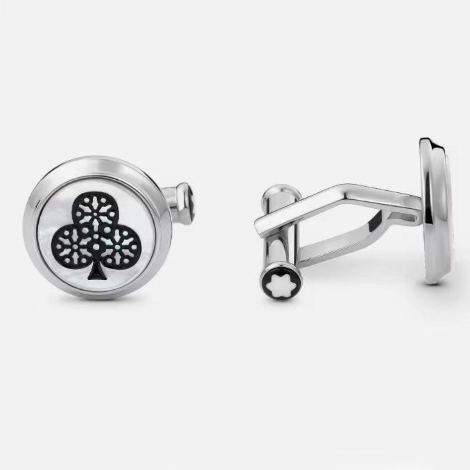Montblanc's Meisterstück cufflinks pay homage to the book "Around the World in 80 Days." Crafted from stainless steel with a mother-of-pearl inlay, this model features an embossed ace of spades and an ace of diamonds, symbols inspired by one of the novel's key elements: the suits of playing cards.