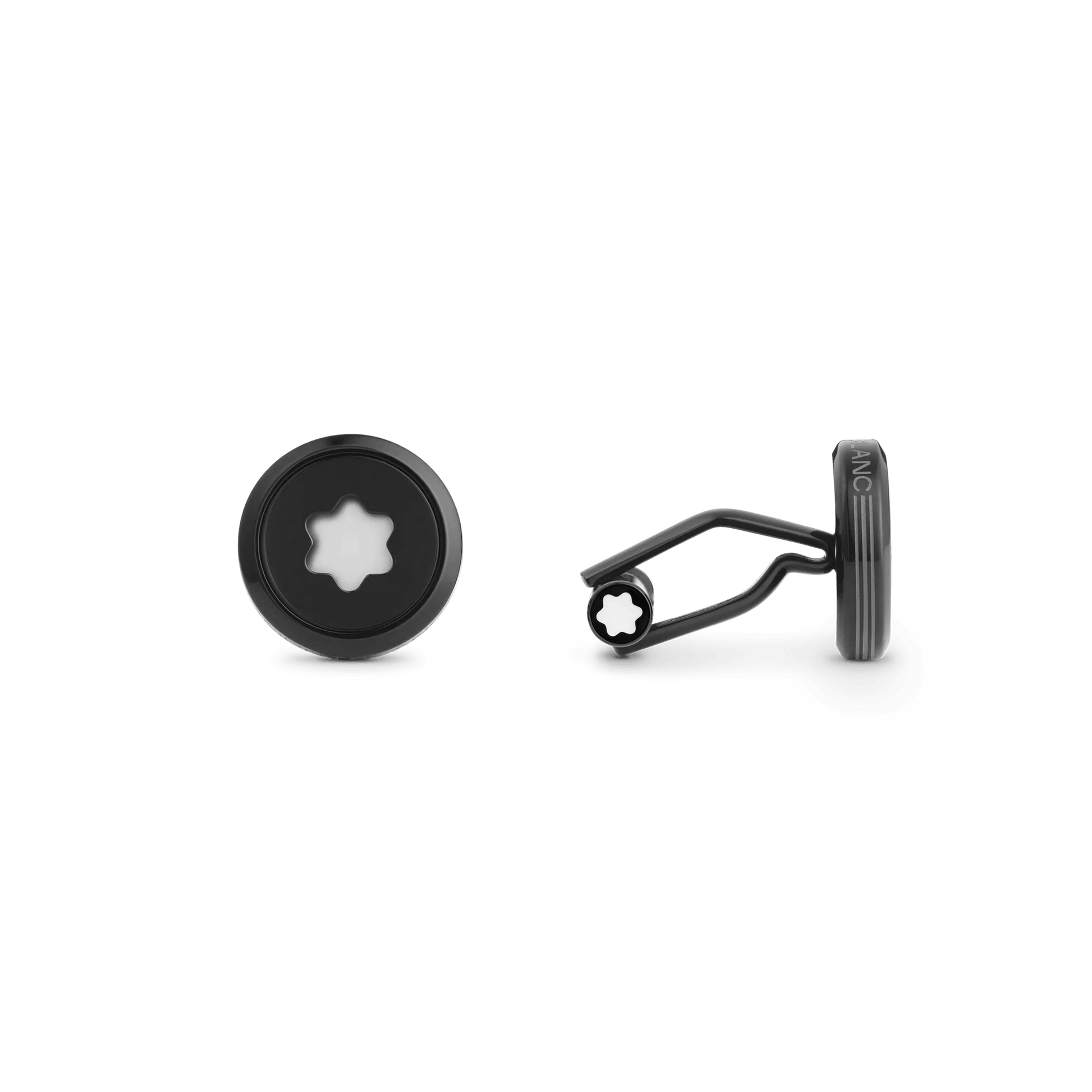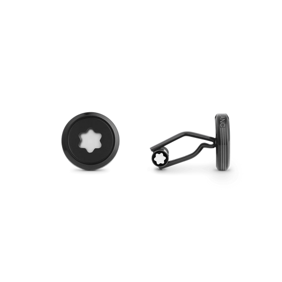 Gemelli in acciaio pregiato con finitura PVD nera. L’emblema Montblanc è rivestito in lacca foto-luminescente.