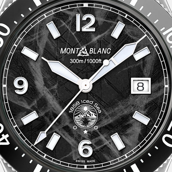 Il primo orologio da immersione sportivo di Montblanc, il Montblanc 1858 Iced Sea Automatic Date, presenta un quadrante con motivo “ghiacciaio” che dà l’impressione di guardare nelle profondità di un ghiacciaio. Questo quadrante nero con motivo “ghiacciaio” è ispirato al Mer de Glace (Mare di Ghiaccio), il ghiacciaio principale del Massiccio del Monte Bianco. La sua texture è stata ottenuta utilizzando una tecnica ancestrale quasi dimenticata chiamata gratté-boisé. Il segnatempo presenta inoltre una lunetta unidirezionale in ceramica bicolore, un fondello inciso e un bracciale conico in acciaio pregiato intercambiabile con regolazioni raffinate, per una vestibilità perfetta. Il segnatempo è conforme alla normativa ISO 6425 per gli orologi da immersione ed è impermeabile fino a 300 metri.