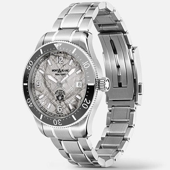 Il Montblanc 1858 Iced Sea Automatic Date con il suo quadrante grigio con motivo “ghiacciaio” dà l’impressione di guardare nelle profondità di un ghiacciaio ricco di minerali accumulatisi per millenni. Ispirata al Mer de Glace, questa texture glaciale è stata ottenuta utilizzando una tecnica ancestrale quasi dimenticata chiamata gratté-boisé. Il segnatempo da 41 mm è corredato di un bracciale in acciaio pregiato intercambiabile, che può essere sostituito in modo facile e veloce con un cinturino in caucciù nero con profilatura grigia senza bisogno di ritornare in boutique o utilizzare alcuno strumento. L’orologio è altresì regolabile al polso quando lo si indossa durante le immersioni subacquee. Il segnatempo è conforme alla normativa ISO 6425 per le immersioni subacquee, è impermeabile fino a 300 metri e presenta indicatori luminescenti che consentono la lettura anche in caso di scarsa illuminazione.