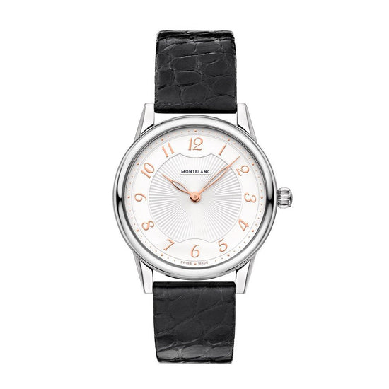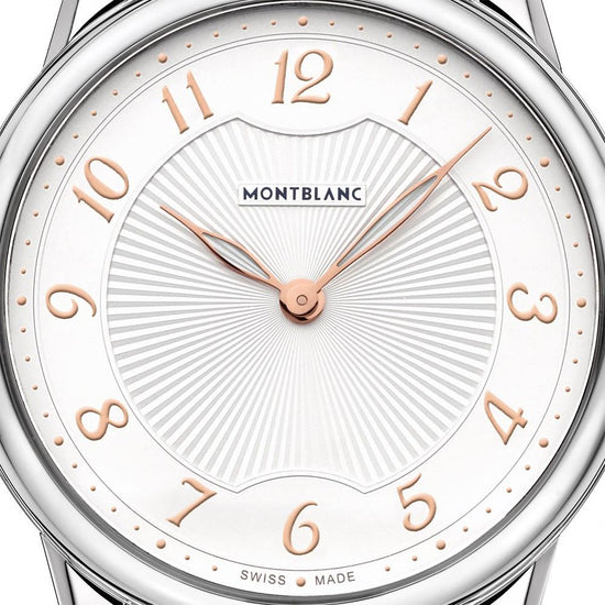 Bohème is Montblanc's key women's line that uniquely interprets the codes of fine watchmaking. It combines simplicity with timeless design and refined complications for modern, independent women. The Bohème Quartz model features a 34 mm polished stainless steel case with slightly curved faceted horns and a sculpted onion-shaped crown. The silvery-white guilloché dial features skeletonized leaf-shaped hands, floral Arabic numerals, a minute track with raised dot markers, and an inner hour ring. All these details further emphasize the refinement of the timepiece.