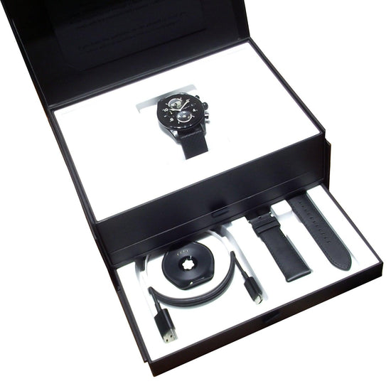 MATERIALE CINTURINO: Cinturino in caucciù nero con fibbia ad ardiglione in acciaio pregiato e cinturino realizzato a mano in pelle di vitello nera italiana con fibbia ad ardiglione in acciaio pregiato. Realizzato per garantire durata e comfort. Compatibile con tutti gli smartwatch Montblanc Summit.