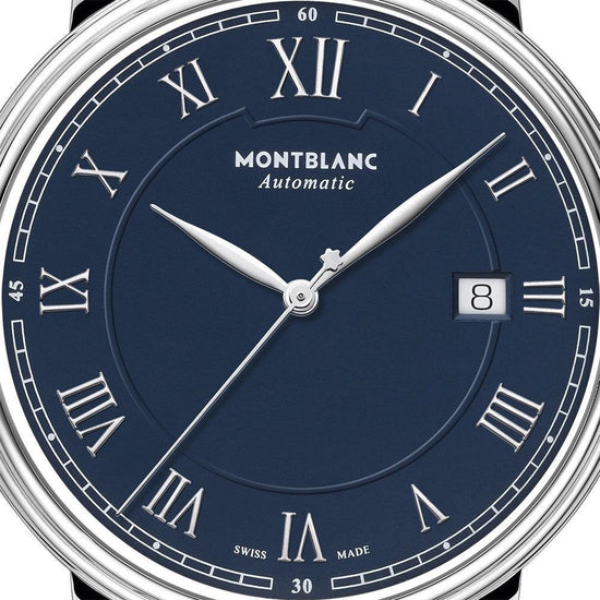 Il Montblanc Tradition Date Automatic sfoggia un esclusivo design Montblanc abbinato ai codici dell’orologeria classica. La cassa in acciaio pregiato presenta le tipiche anse diritte Montblanc e una caratteristica lunetta doppia con vetro zaffiro bombato. Il design esprime i codici dell’orologeria classica, come il nuovo quadrante blu con numeri romani e un imponente numero romano “XII”. La tradizionale minuteria “chemin de fer” e le classiche lancette a foglia e a bastone completano il look elegante.